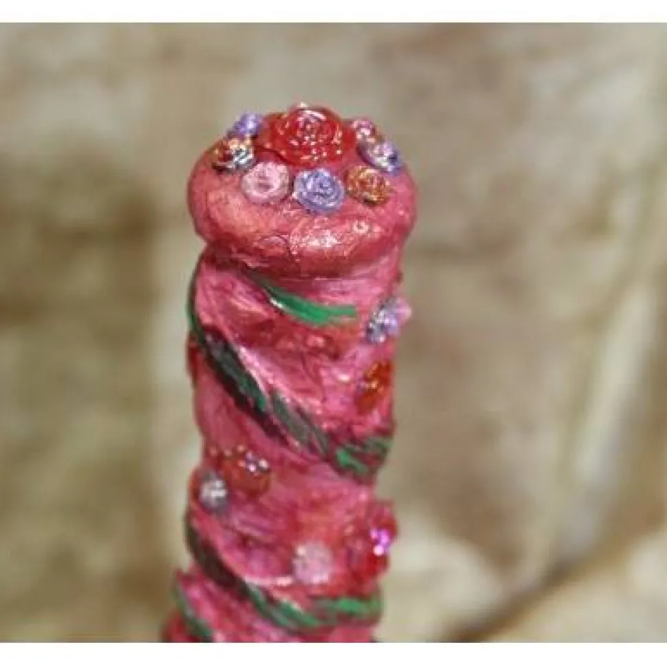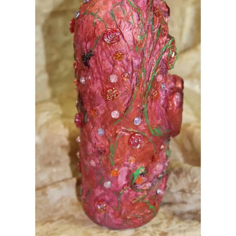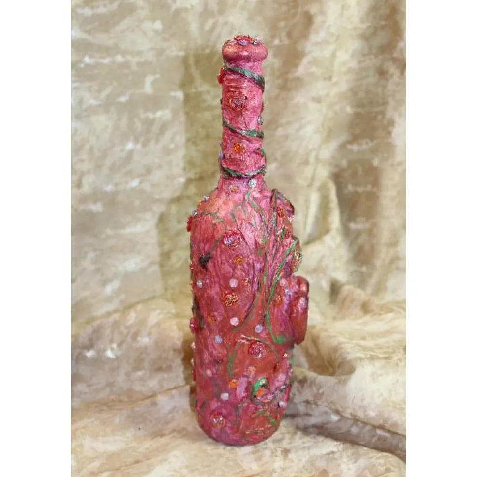 Acrylmalerei/Collage auf einer Glasflasche. Witziges Upcycling-Projekt, künstlerisch gestaltet mit Styropor, Papier und Glitzersteinen in Rosenform. Bemalt mit Acrylfarben Rosa, Grün und schillerndem Lila.