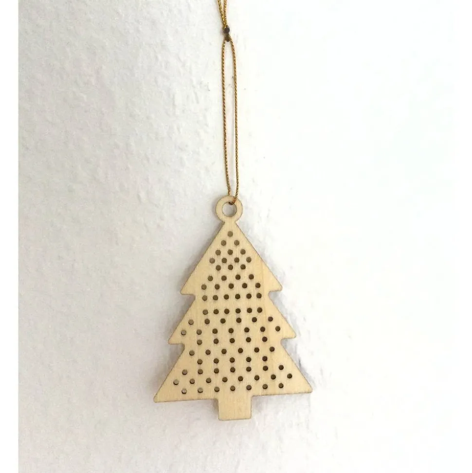 Die Weihnachts-Deko-Hänger, eine Kugel und ein Bäumchen, können an einem goldenen Aufhängerbändchen aufgehängt werden.