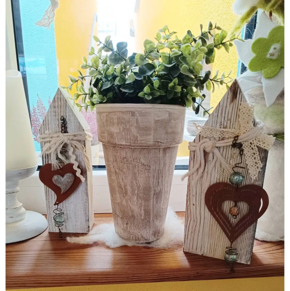 wunderschön sehen dieses Häuschen auf dem Fensterbrett, dem Regal oder neben dem Blumenstock aus!