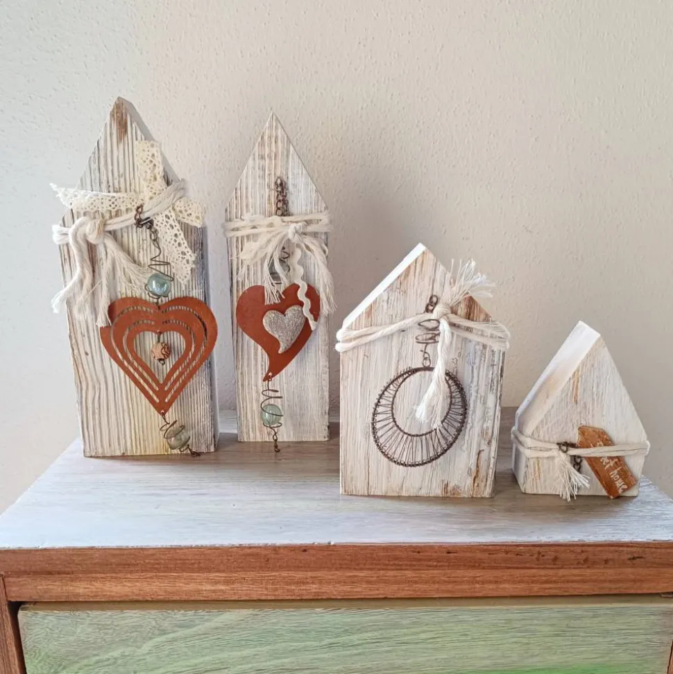 mit altweißer Acrylfarben gestrichen, wobei das braun des Holzes noch durchschimmert und mit Herzen aus Rostblech und Makrameeseil, sowie cremefarbenen Spitzenborden verziert.