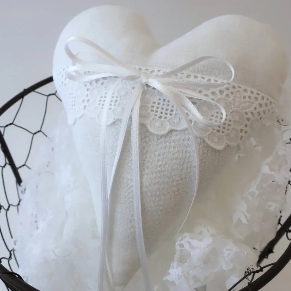 Dieses natürlich anmutende Dekoherz aus Baumwolle ist ein liebevolles Geschenk und eine stilvolle Dekoration für dein Wohn- oder Schlafzimmer. Die weiße Baumwolle in Leinwandoptik trifft auf filigrane Durchbruchspitze und ein zartes Satinbändchen – so erhält das Herz eine elegant-gemütliche Ausstrahlung, die Vintage-Style, Shabby Chic und Landhaus-Stil perfekt ergänzt.