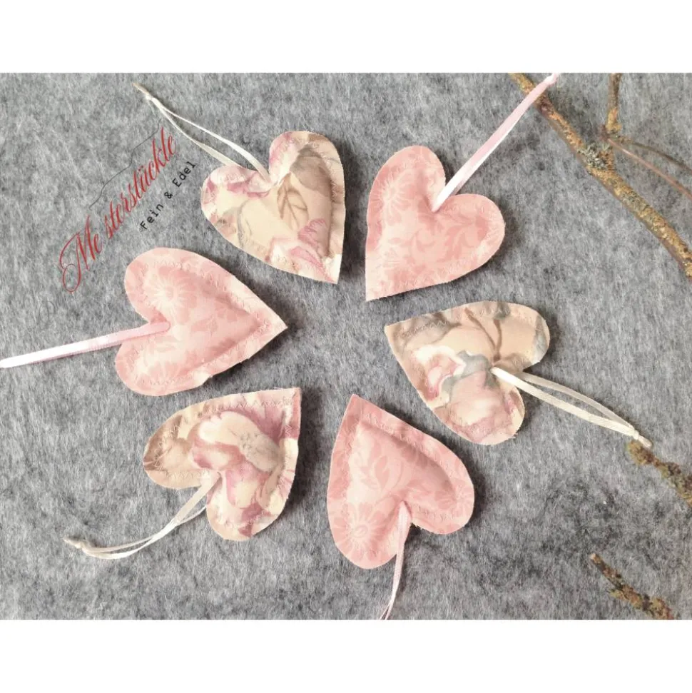 * 6-er Set (3x rosé / 3x beige mit Blumenmotiv) kleine Stoffherzchen zur Deko, Herzanhänger, Dekohänger