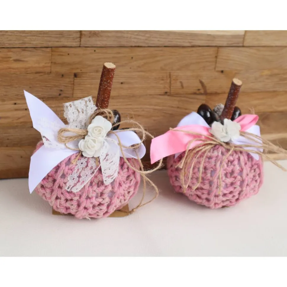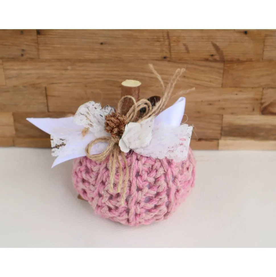Süßer gehäkelter Dekokürbis in rosa Tönen. Den Kürbis habe ich oben mit verschiedenen Materialien dekoriert und zum Abschluß noch eine hübsche Schleife befestigt.