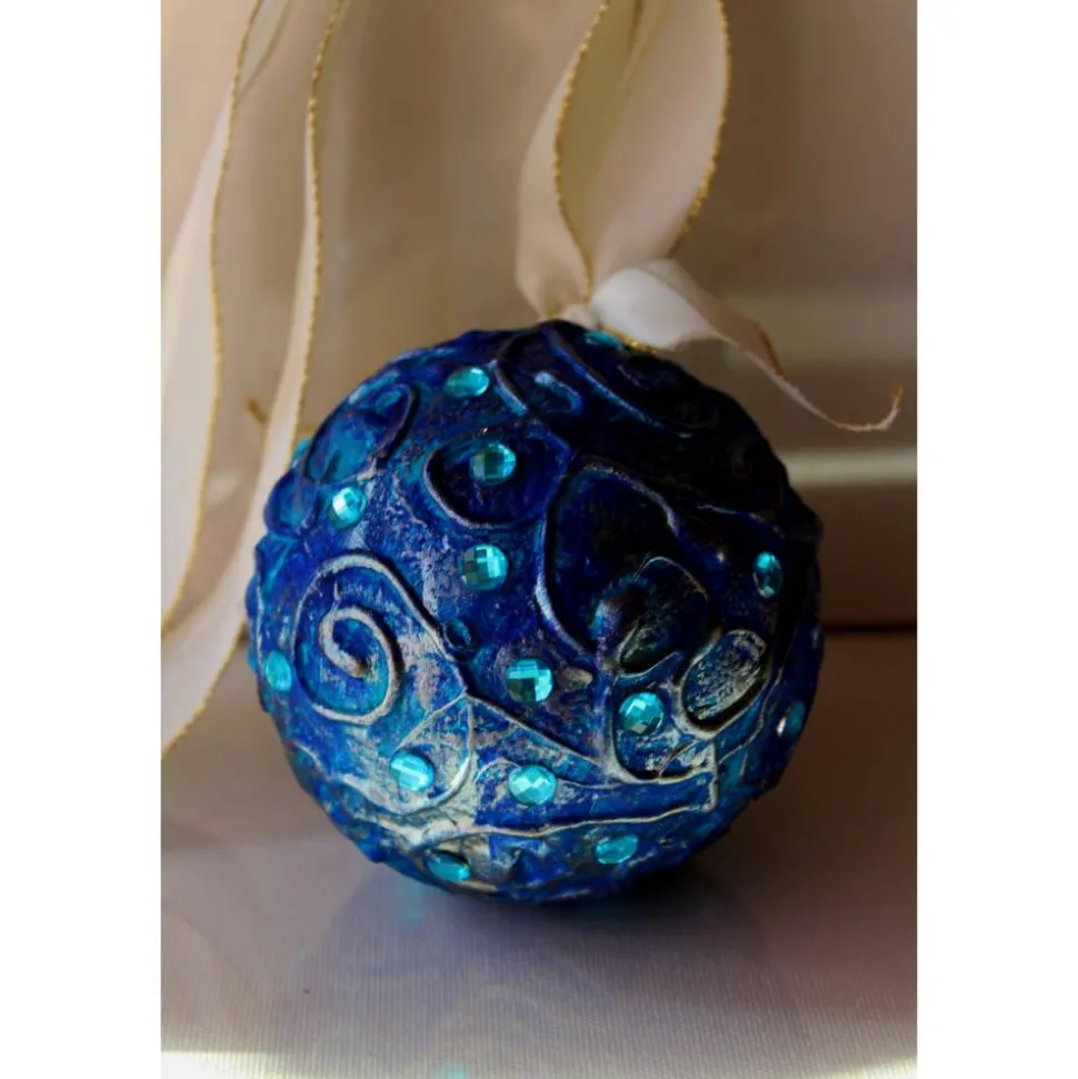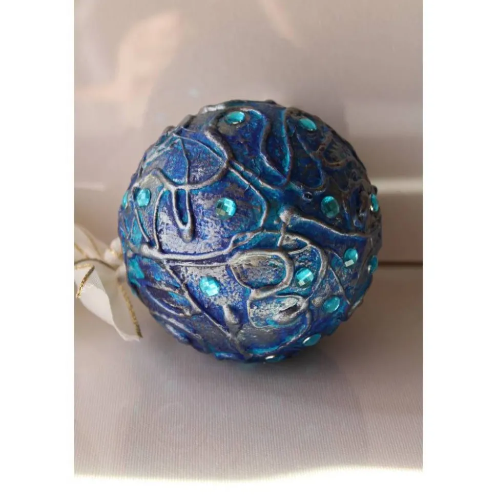 Gestaltet aus einer Styroporkugel. Bemalt mit Acrylfarben in Blau, Türkis und Silber. Dekoriert mit Glitzersteinen. Das Band ist an einem Haken befestigt, kann nach belieben ausgetauscht werden.