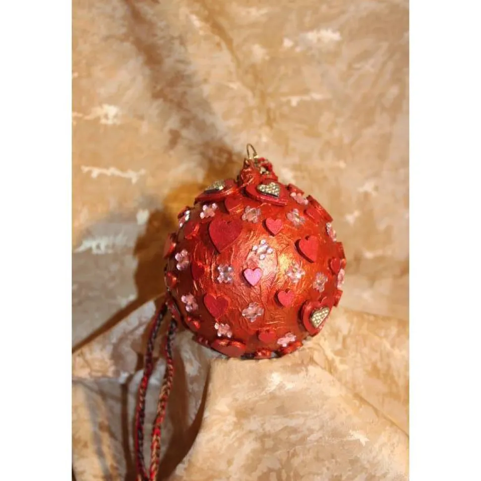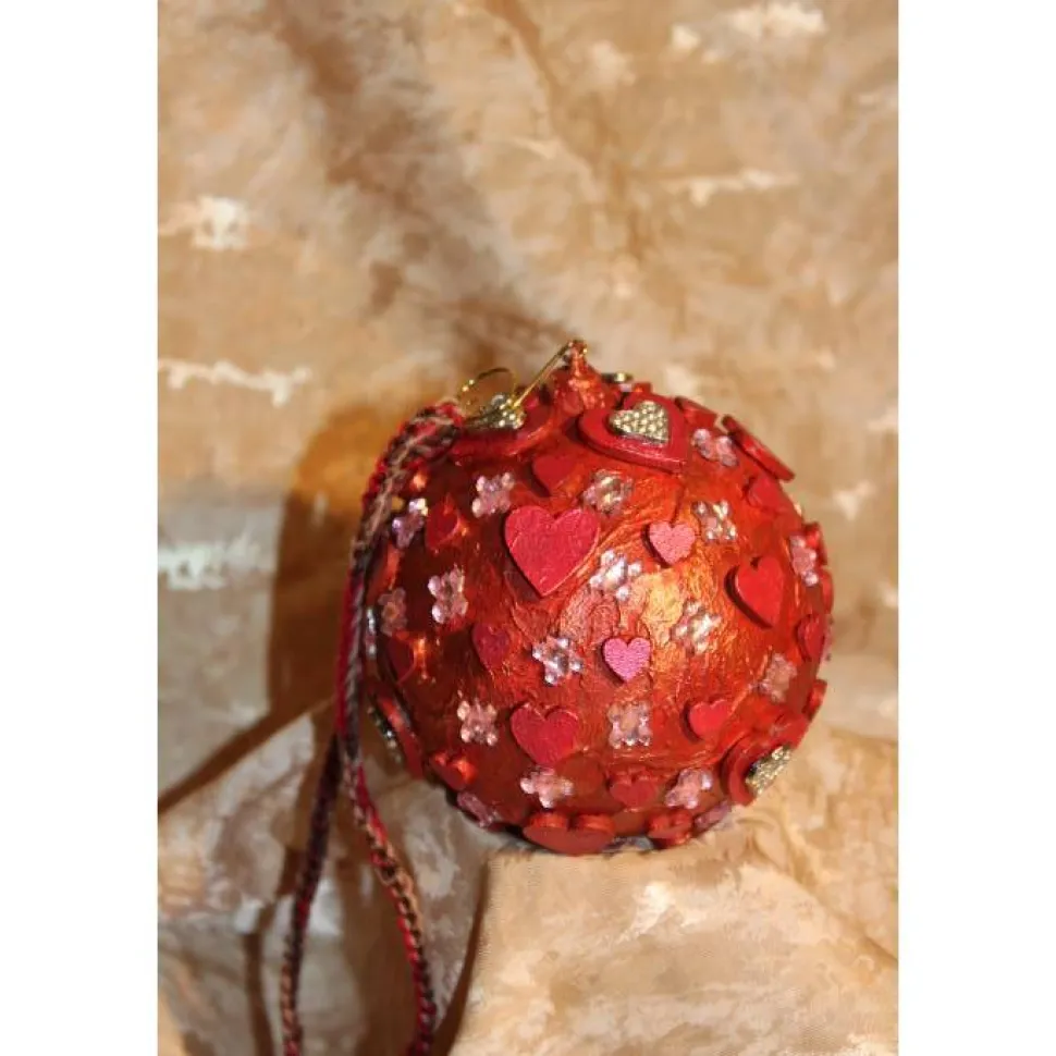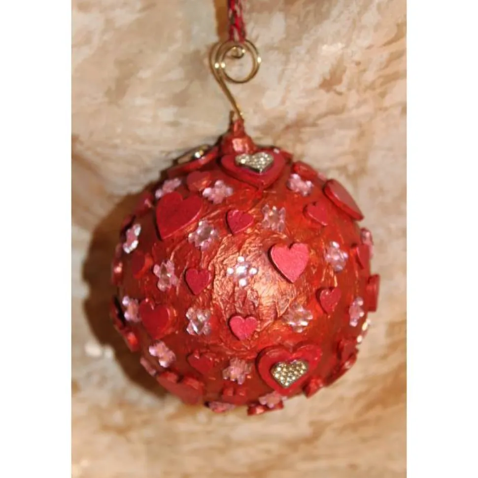 Gestaltet aus einer Kunststoffkugel. Bemalt mit Acrylfarben in Rot und Rosarot. Dekoriert mit schillernden Glitzersteinen, Holz- und Metallherzen. An der Kugel ist ein kleiner, goldfarbener Zierhaken angebracht. Als Aufhängung wird ein gehäkeltes Bändchen mitgeliefert.