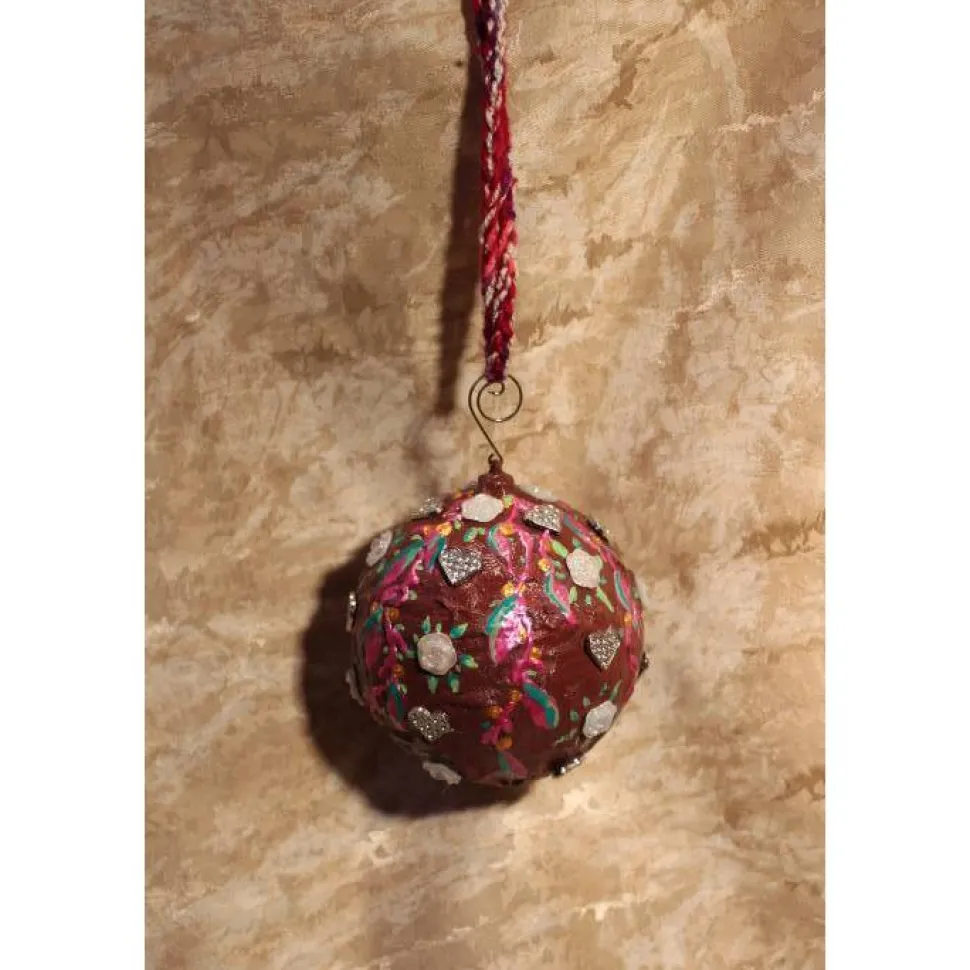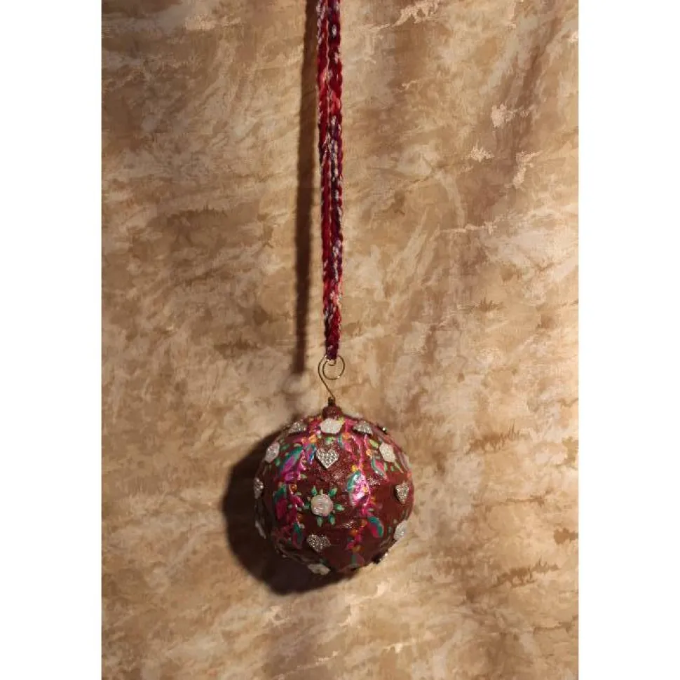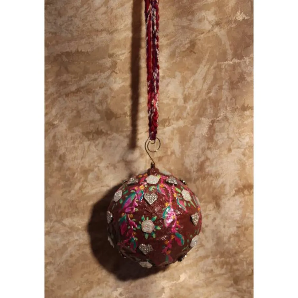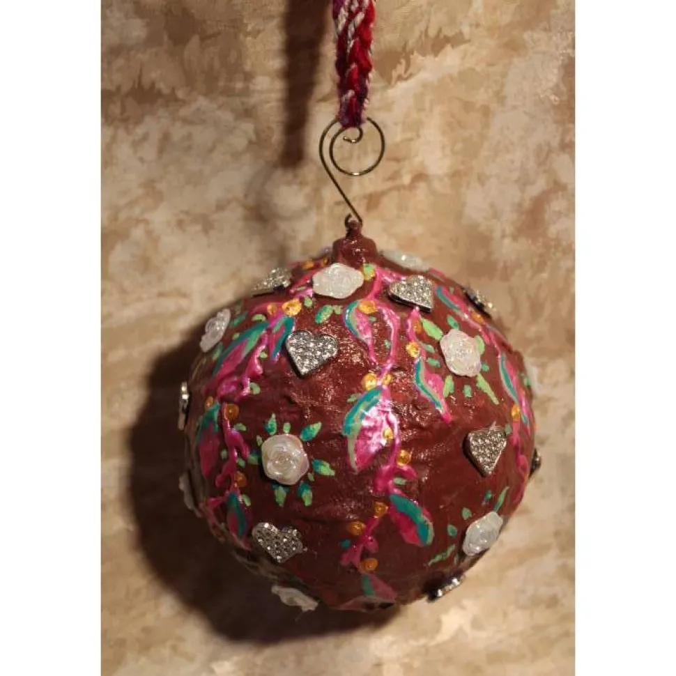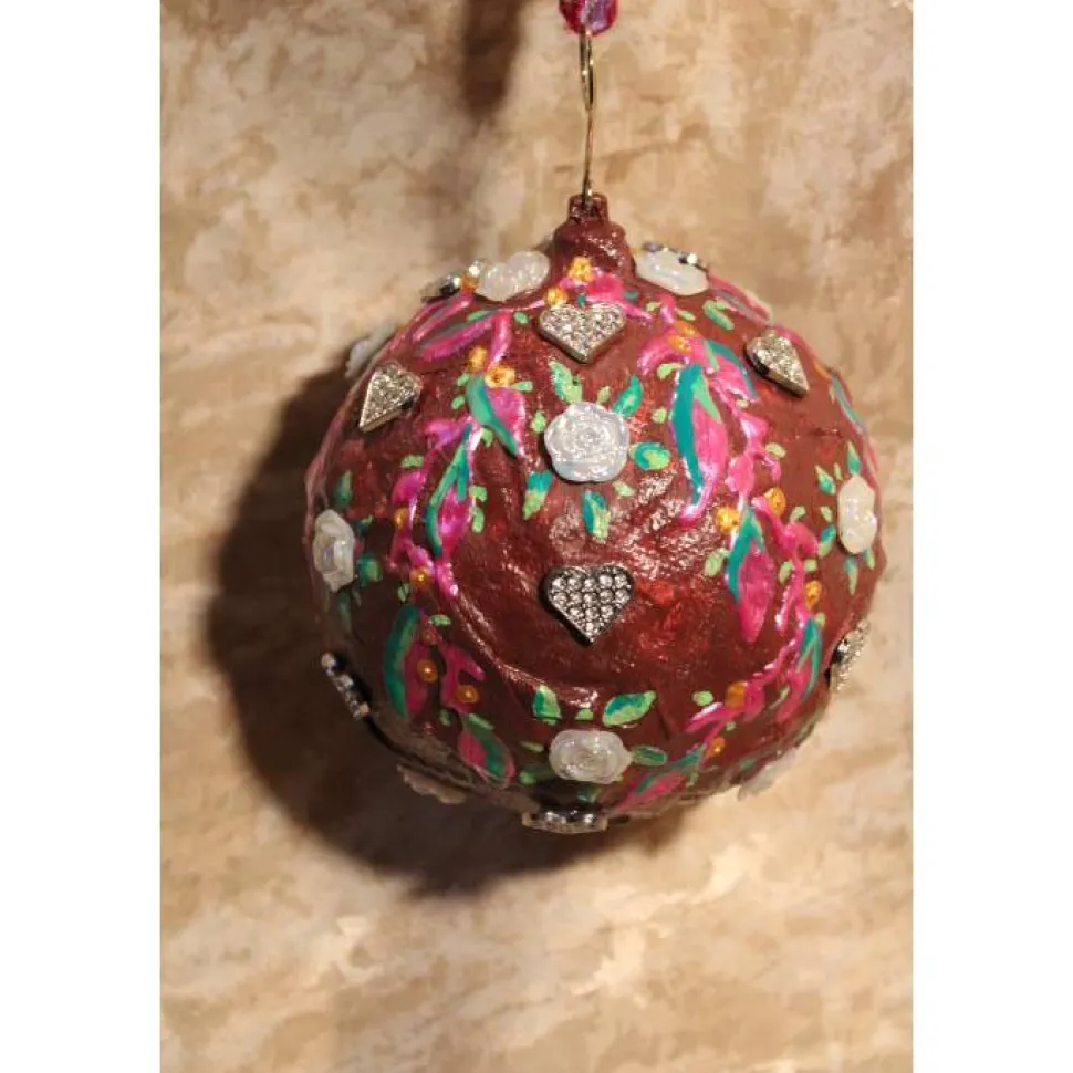 Gestaltet aus einer Kunststoffkugel. Bemalt mit Acrylfarben in Bordeaux, Pink und Grün. Dekoriert mit irisierenden Rosen in weiß und glitzernden Metallherzen. An der Kugel ist ein kleiner, goldfarbener Zierhaken angebracht. Als Aufhängung wird ein gehäkeltes Bändchen in passenden Farben mitgeliefert.