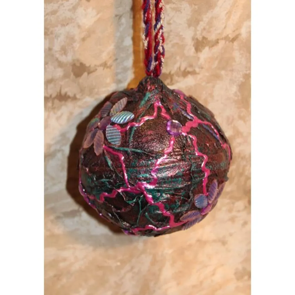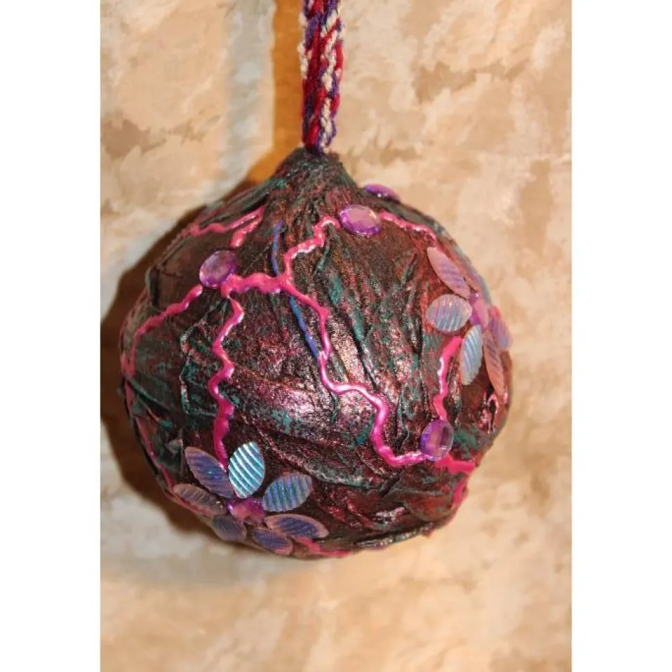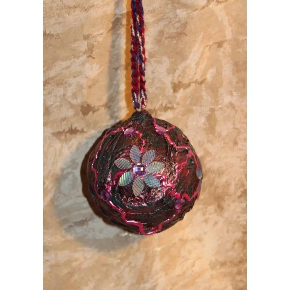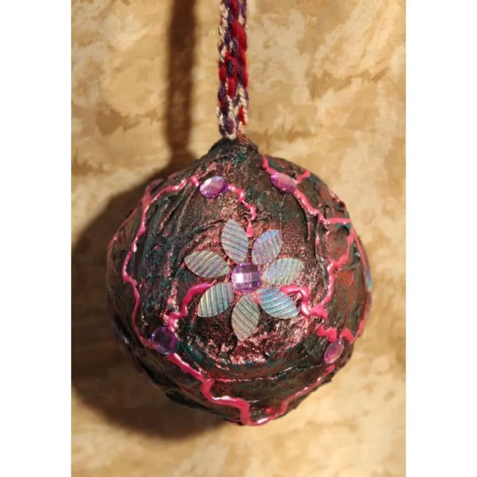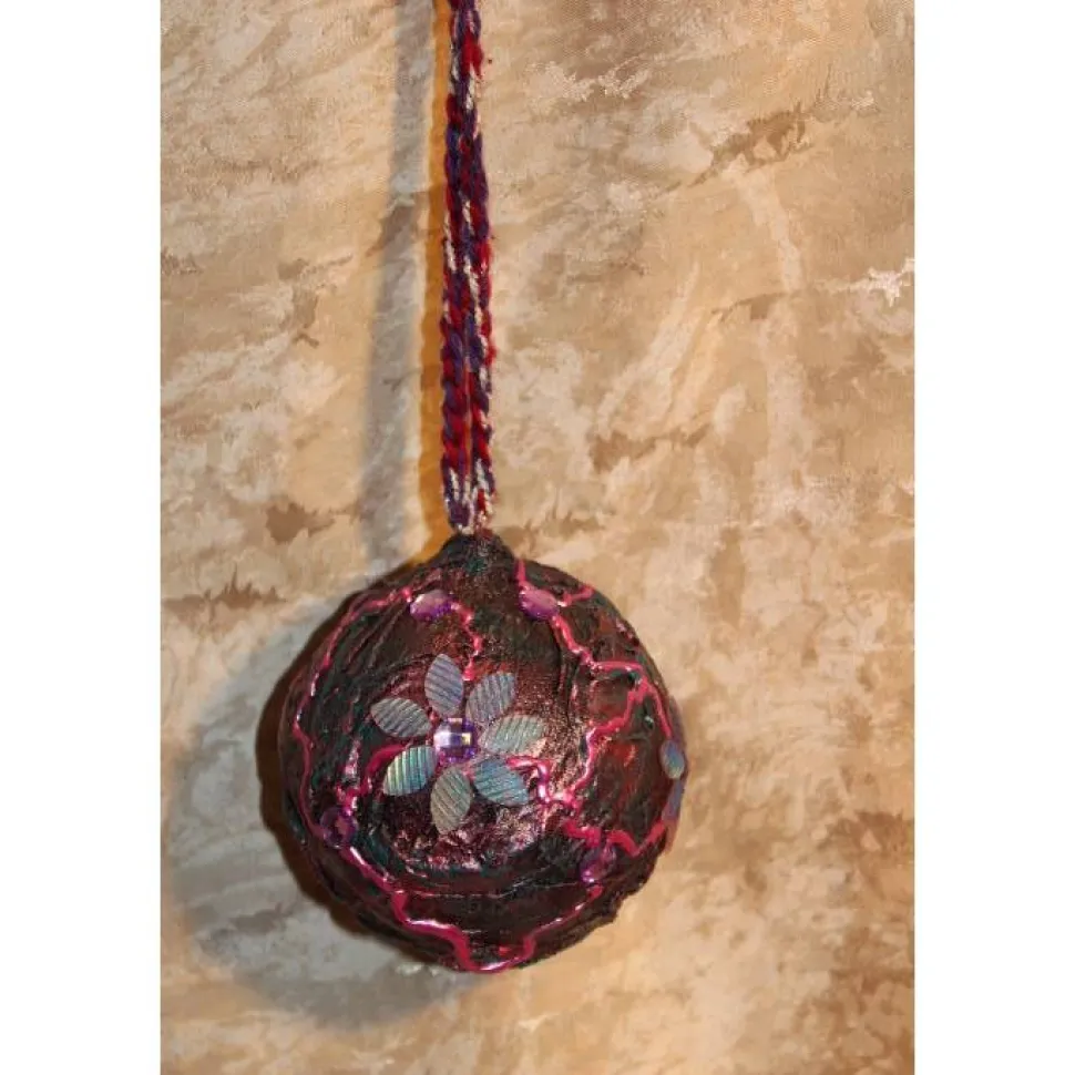 Gestaltet auf einer Kunststoffkugel und Stoff. Bemalt mit Acrylfarben in Dunkellila, Pink und Dunkelgrün. Dekoriert mit irisierenden Blütenblättern und lila Glitzersteinen. An der Kugel ist ein gehäkeltes Bändchen in passenden Farben angebracht.