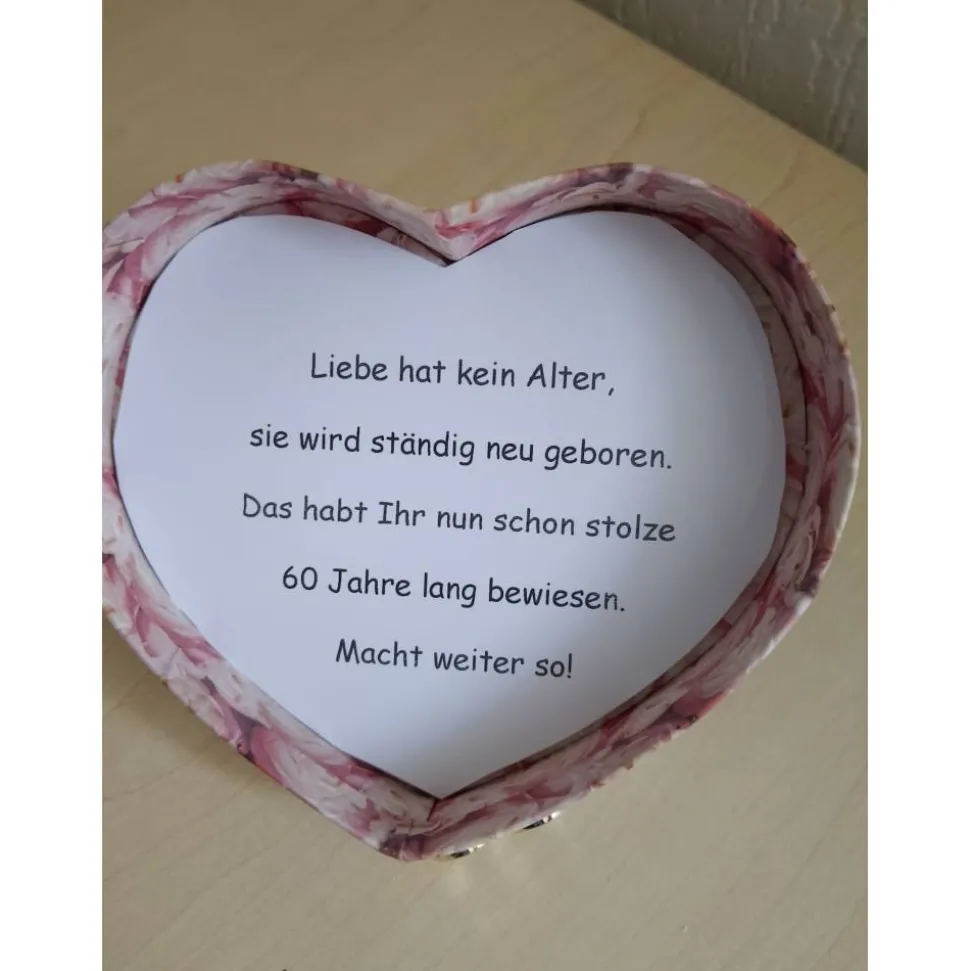 Im Inneren des Deckels erwartet dich ein kleines, individuell anpassbares Gedicht. Damit wird deine Geldgeschenk-Dekoration zu etwas ganz Persönlichem. Liebe hat kein Alter, sie wird ständig neu geboren. Das habt Ihr nun schon stolze 60 Jahre lang bewiesen. Macht weiter so!