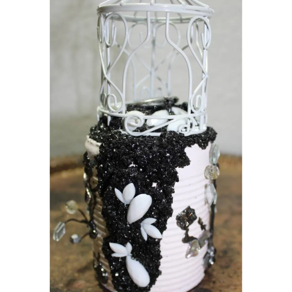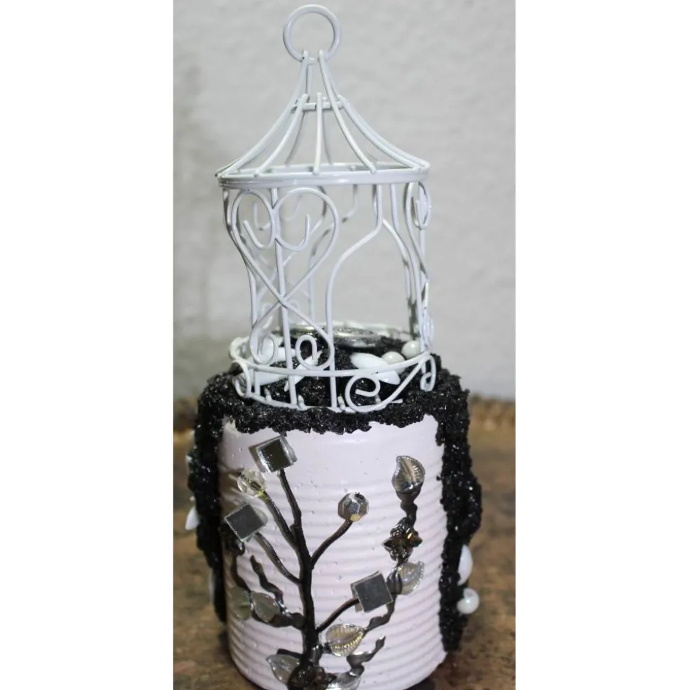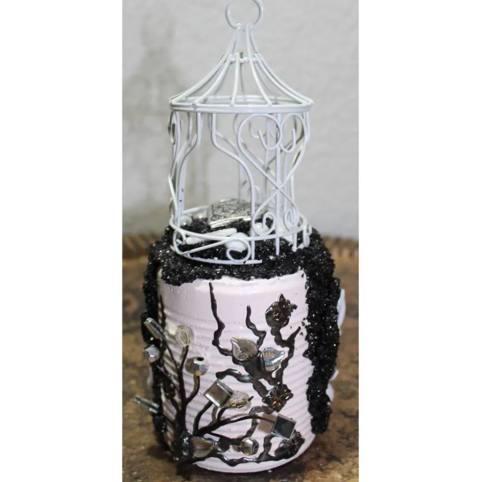 Ein aus Beton gegossenes Objekt in Form einer Konservendose. Künstlerisch gestaltet mit Acrylfarben in weiß und grau. Verziert mit Schmucksteinen und Kunststoffperlen, sowie schwarzem Granulat. Die kleinen Spiegelzweige und der angebrachte Minivogelkäfig runden die kleine Gestaltung ab. In der Mitte des Käfigs ist ein kleines, silbernes Herz platziert.