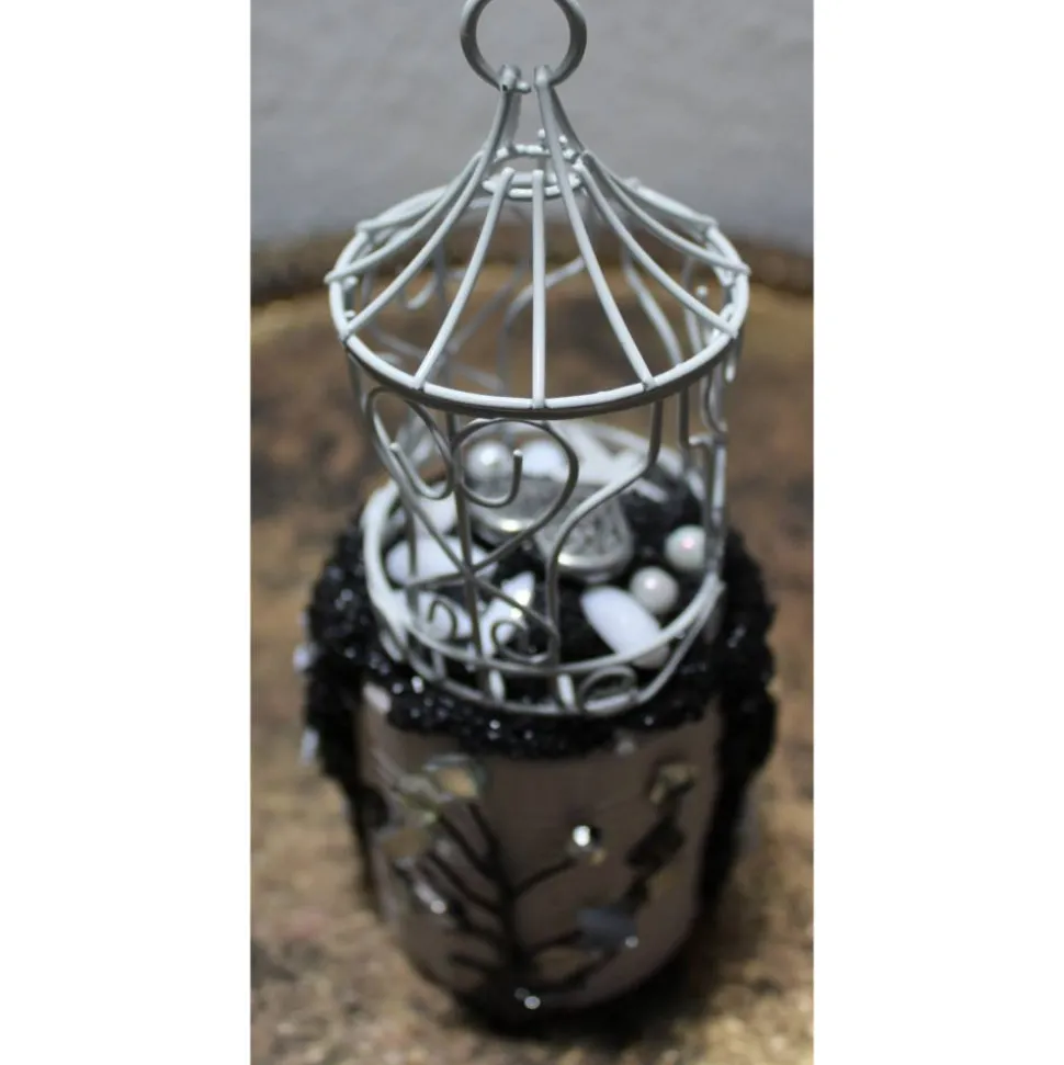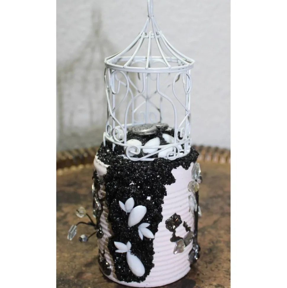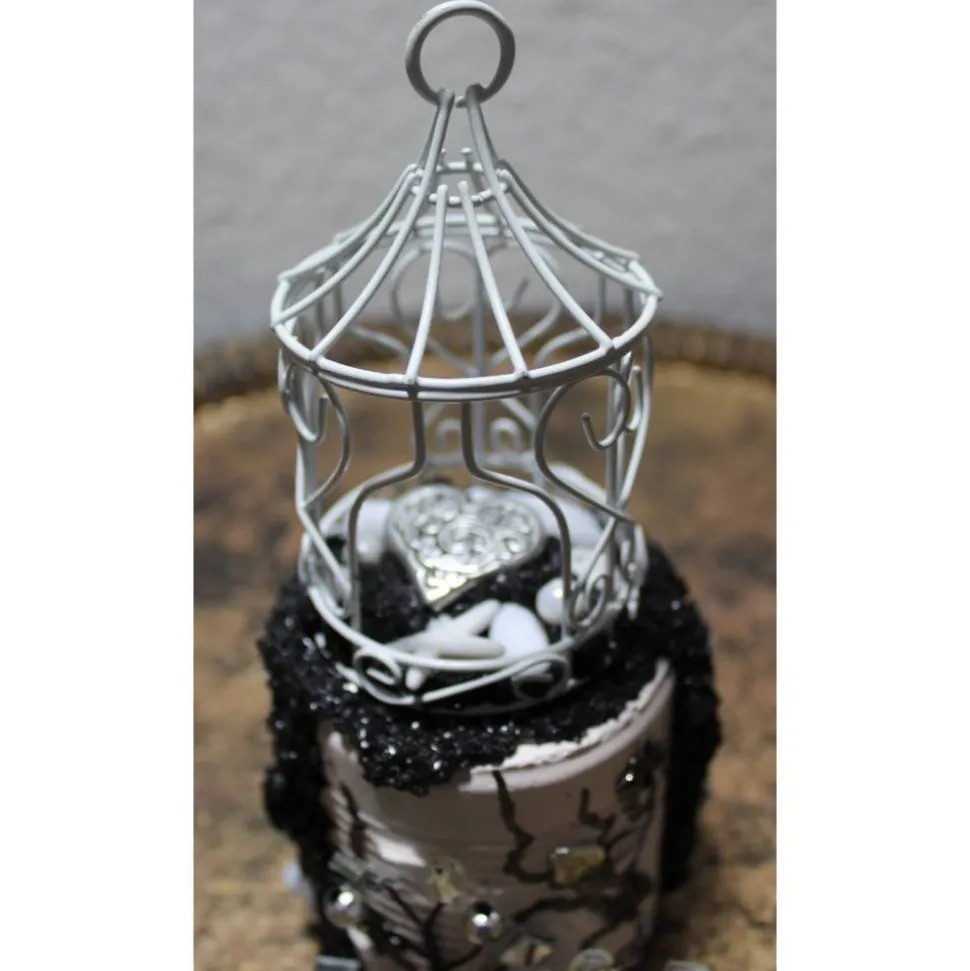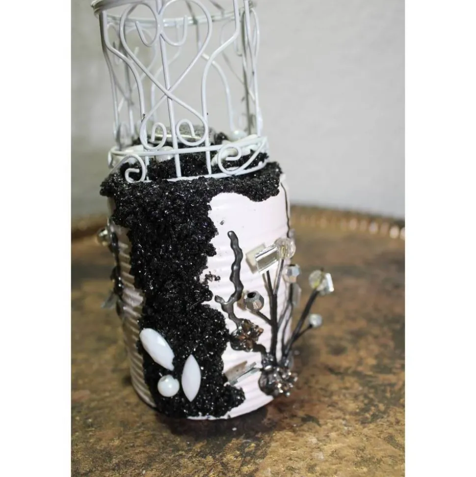 Ein aus Beton gegossenes Objekt in Form einer Konservendose. Künstlerisch gestaltet mit Acrylfarben in weiß und grau. Verziert mit Schmucksteinen und Kunststoffperlen, sowie schwarzem Granulat. Die kleinen Spiegelzweige und der angebrachte Minivogelkäfig runden die kleine Gestaltung ab. In der Mitte des Käfigs ist ein kleines, silbernes Herz platziert.