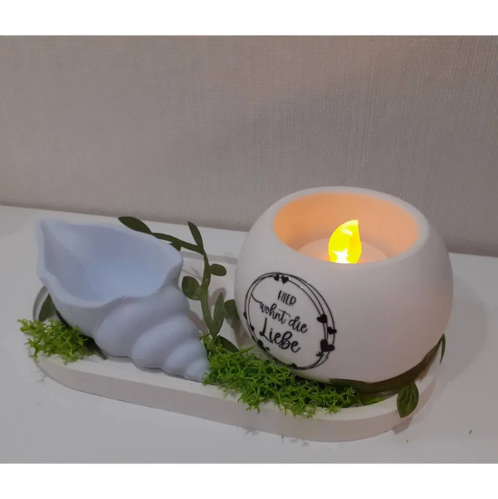 – Ein Teelichthalter aus Keramik (hier zu sehen in der Farbe “ Weiß „) Der Teelichthalter kann auf Wunsch auch gern ohne Spruch erworben werden.
