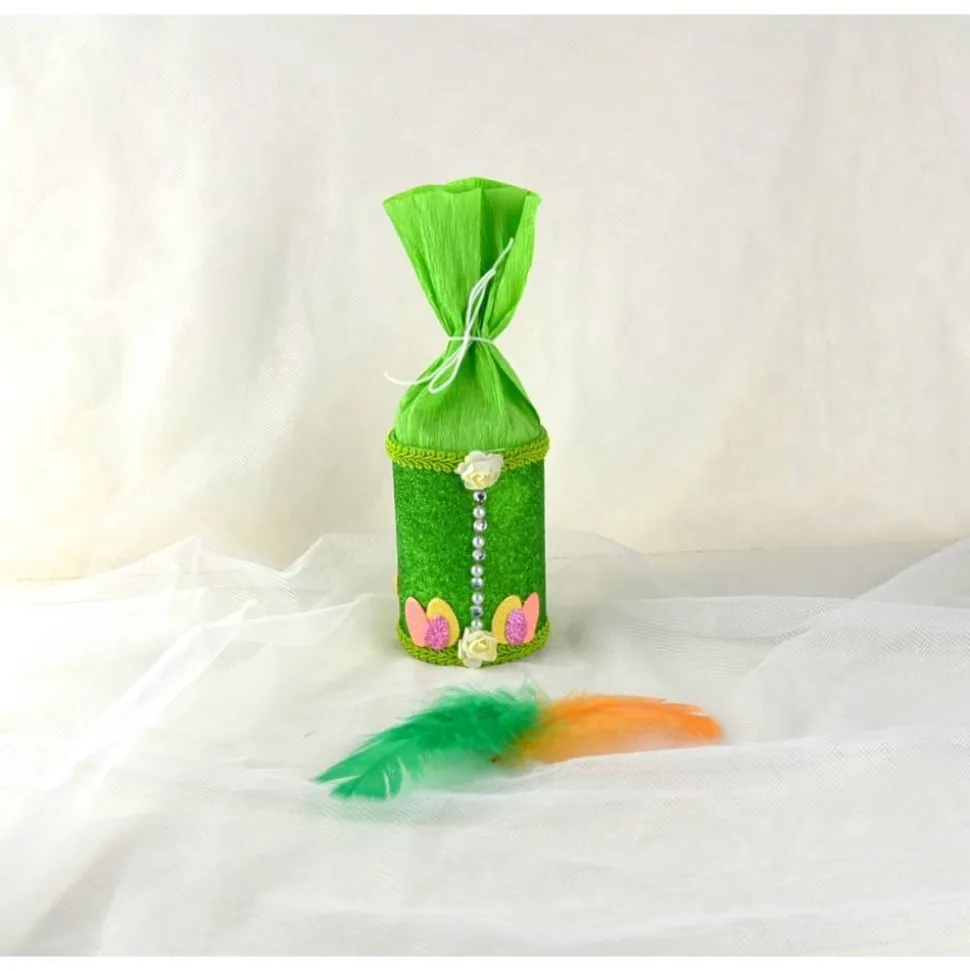 Aufwendig dekorierte Geschenkdose mit Ostermotiven. Sie ist mit Krepppapier zu verschließen (ähnlich wie bei Schultüten). Ideal zum verschenken von kleinen Osterhasen, Geld oder Gutschein. Die Dose ist mit Glitter-Moosgummi, Stanzteilen aus Samtkarton, Papierblumen sowie mit Strass- und Stoffbordüre dekoriert.