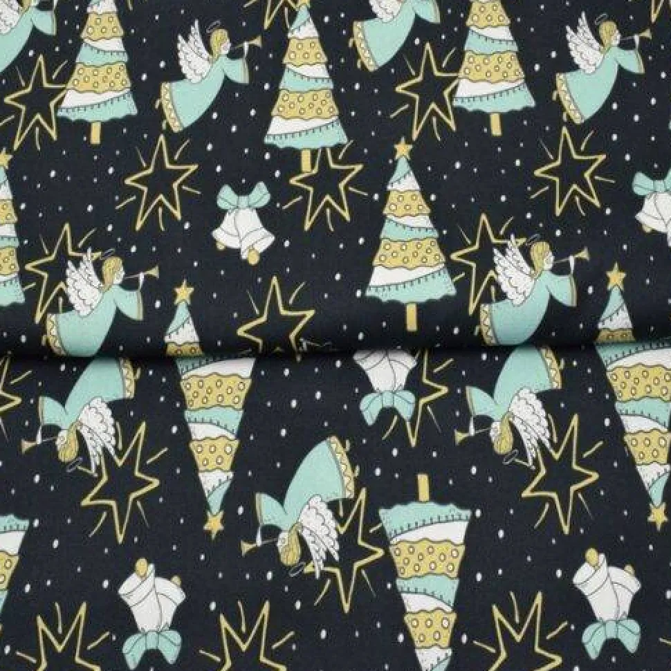 Entdecke den hochwertigen Dekostoff mit Weihnachtsengeln und Sternen auf schwarzem, weißem, ockerfarbenem und türkisem Grund – ideal für festliche Nähprojekte!