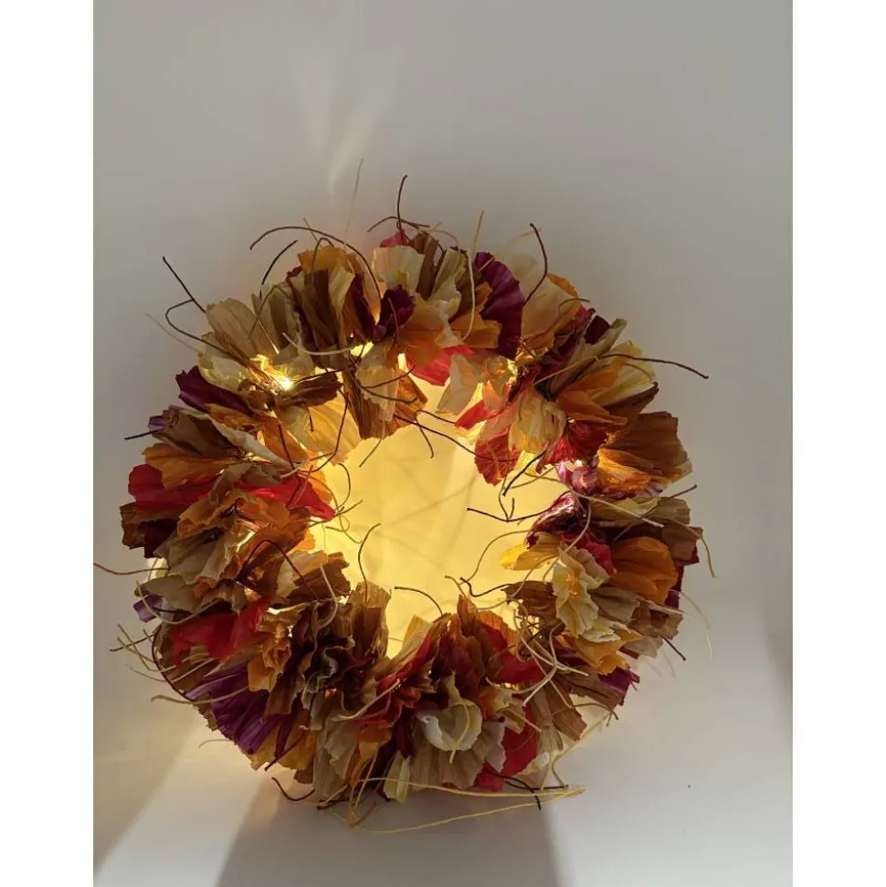 An die 100 einzeln zugeschnittene, geöffnete und dann per Hand geknotete Blätter in vielen verschiedenen Herbstfarben fügen sich zu einem tollen Herbstkranz zusammen, der durch eine kleine Micro-LED-Lichterkette dezent leuchtet. Die Lichterkette hat drei Modi: schnelles Blinken, langsames Blinken oder Dauerleuchten. Gespeist wird sich durch drei mitgeliertere Knopfzellen, die bei Bedarf auch ausgetauscht werden können.