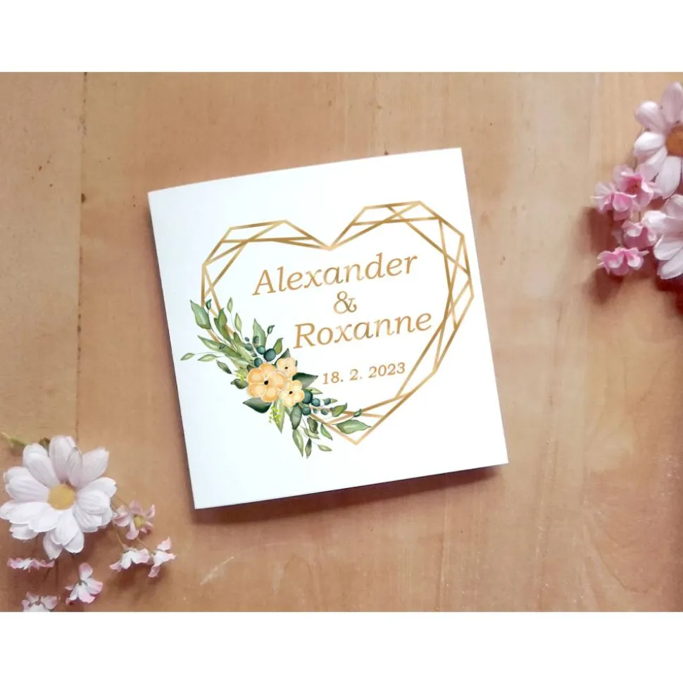 Es kann beliebig personalisiert werden. Im Preis inbegriffen ist eine Personalisierung. Das heißt möchten Sie Save the Date Karten, Hochzeitseinladungen und Dankeskarten bestellen Sie diesen Artikel bitte 3x. Pro Kartenart einmal.