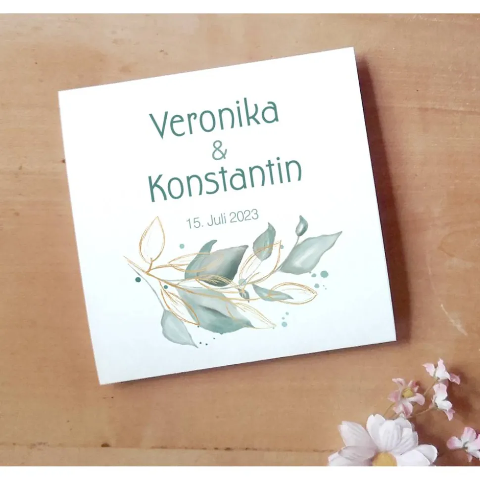 Es kann beliebig personalisiert werden. Im Preis inbegriffen ist eine Personalisierung. Das heißt möchten Sie Save the Date Karten, Hochzeitseinladungen und Dankeskarten bestellen Sie diesen Artikel bitte 3x. Pro Kartenart einmal.