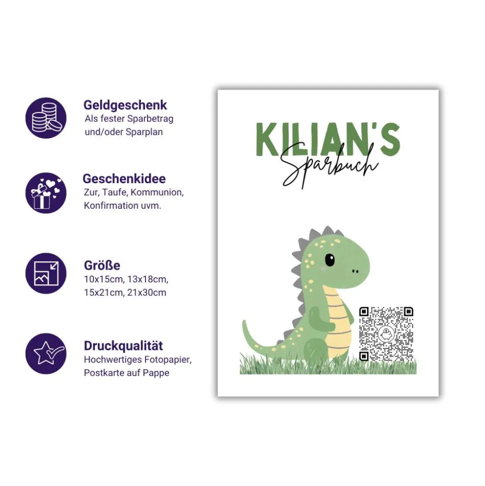 Digitales Sparbuch für Kinder – personalisierte Geschenkidee zur Geburt, Taufe, Einschulung, Kommunion | Dino