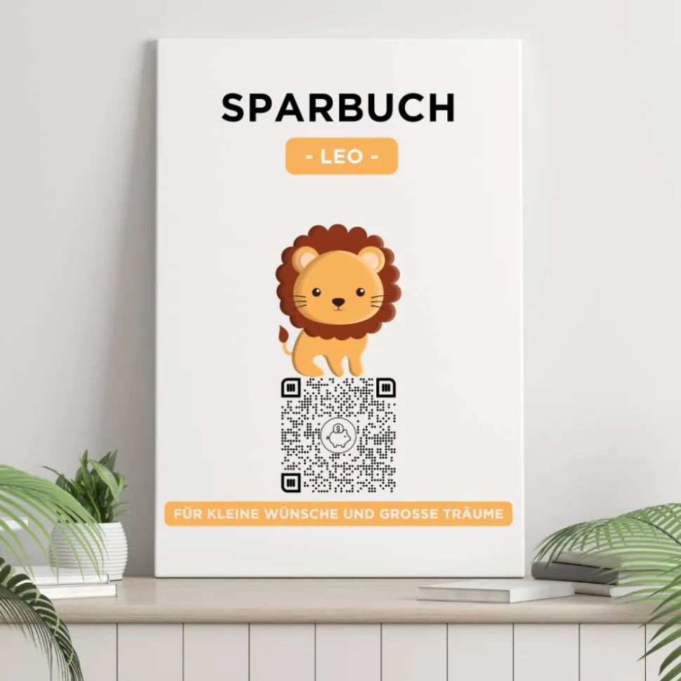 Digitales Sparbuch | Personalisiertes Geldgeschenk | QrCode Bild auf Leinwand 20x30cm | Motiv Löwe