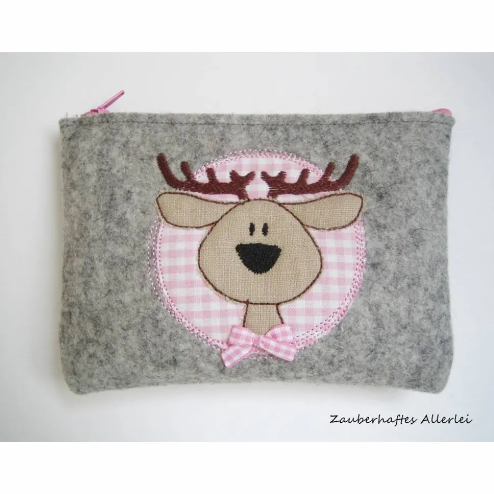 Das niedliche Hirschmotiv ist gestickt und auf einen rosa-weiß karierten Baumwollstoff appliziert. Das Motiv besteht aus einem beigefarbenen Leinenstoff und wurde mit einer rosafarbenen Schleife aufgepeppt.
