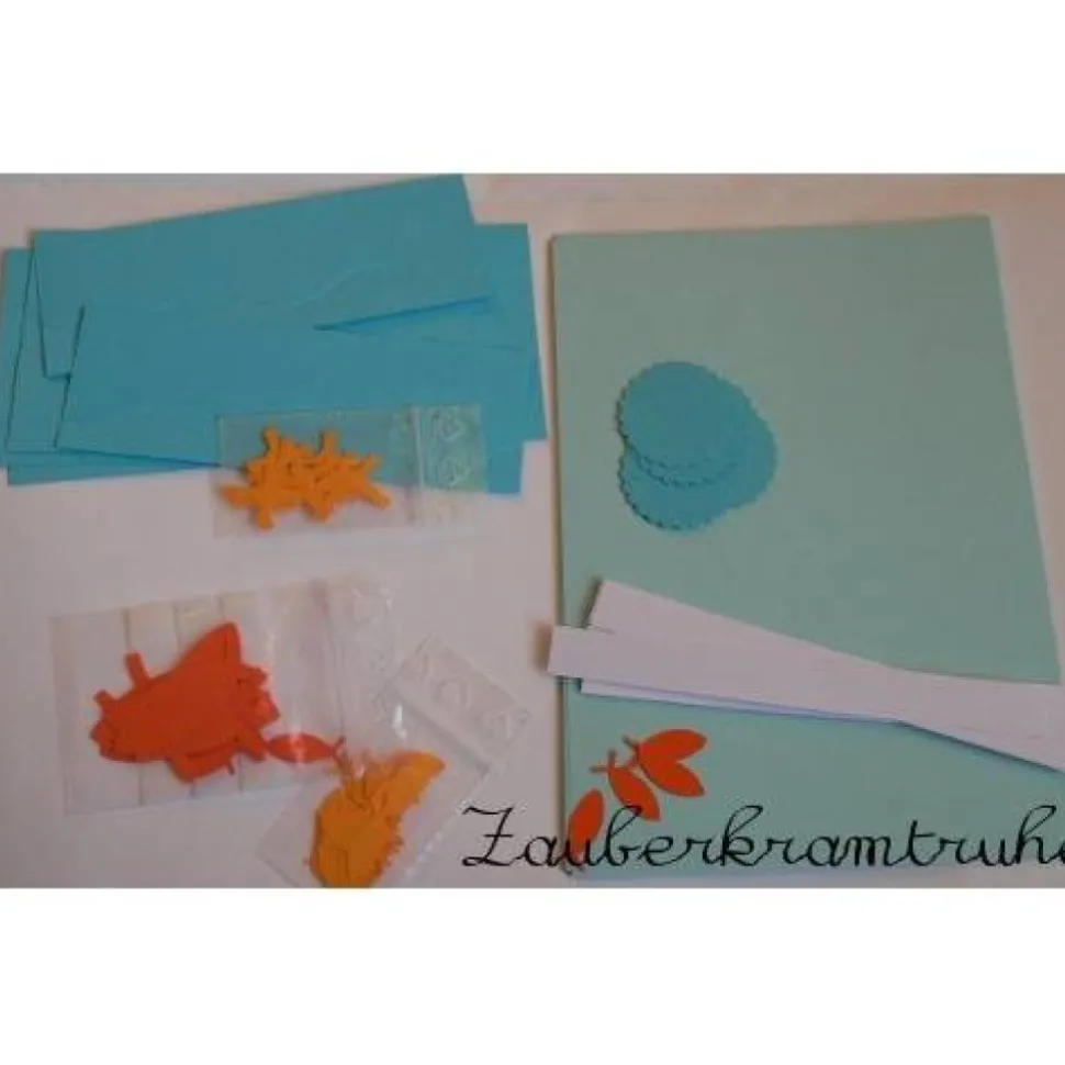 Das DIY-Einladungsset ist für 10 Karten in blau (hellblauer Hintergrund, blaues Meer) mit je einem großen und einem kleinen Fisch in Orange, zwei kleinen Fische in Hellorange, einem Kreuz in Hellorange, einem blauen gewellten Kreis sowie einer weißen Textzeile. Eine Anleitung zum Basteln liegt auch bei.