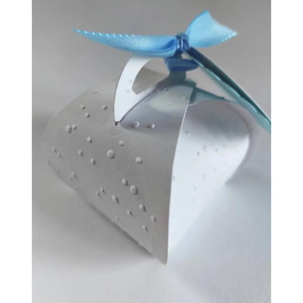 Die Box ist geprägt mit kleinen Pünktchen. Der Wellenkreis und das Satinband kann farblich individuell angepasst werden.