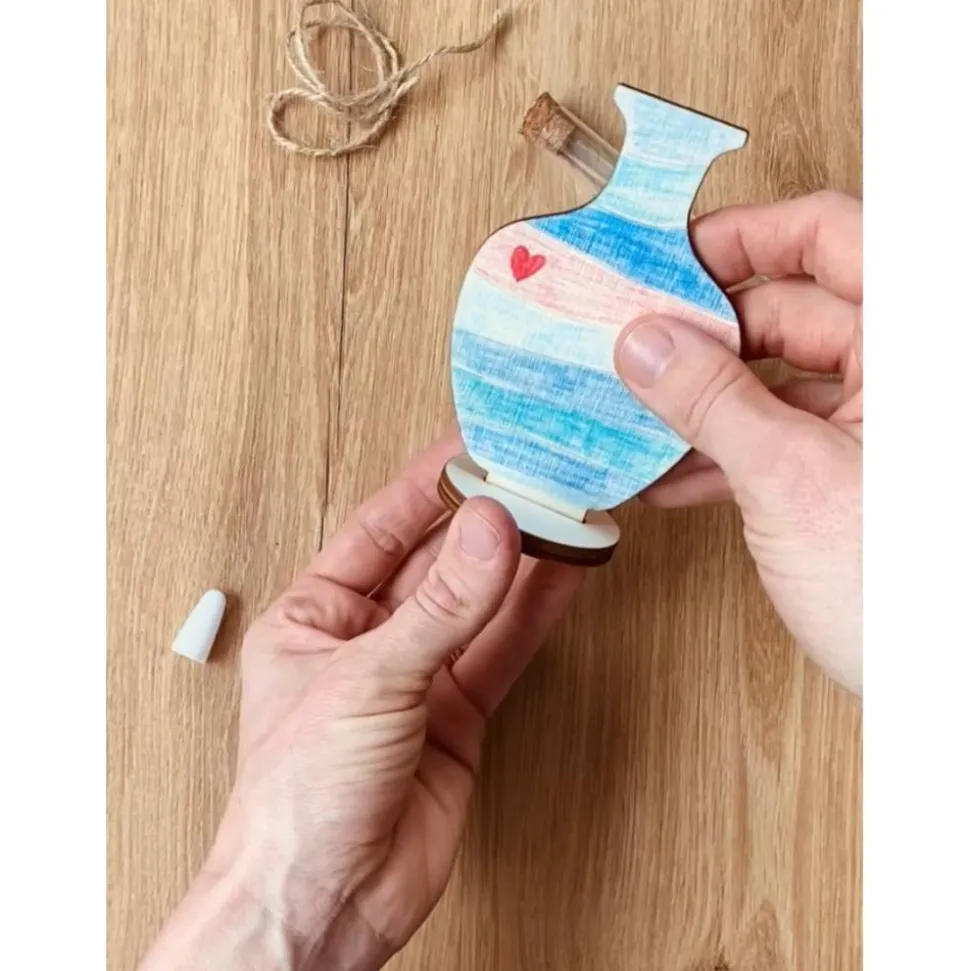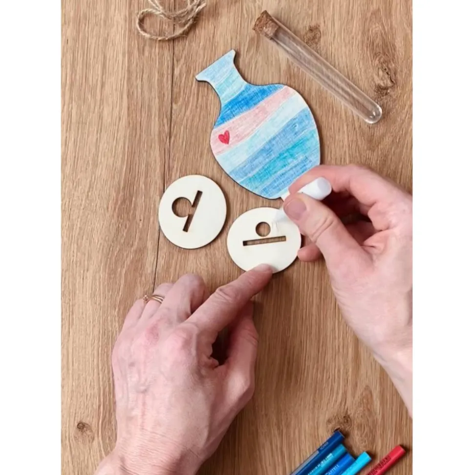 Bevor du die Vase zusammenbaust, kannst du die Holzteile nach Herzenslust bemalen oder gestalten – ganz individuell nach deinem Geschmack! So wird jede Vase zu einem echten Unikat. (Farben sind nicht im Set enthalten.)