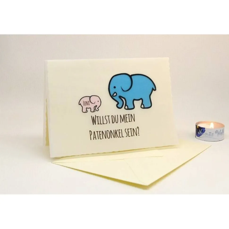 Die Elefanten als Symbol für Familie und Treue stehen hier für die Verbundenheit der Paten mit dem Kleinen. Zusätzlich ist der individuelle Name des Kindes aufgedruckt.