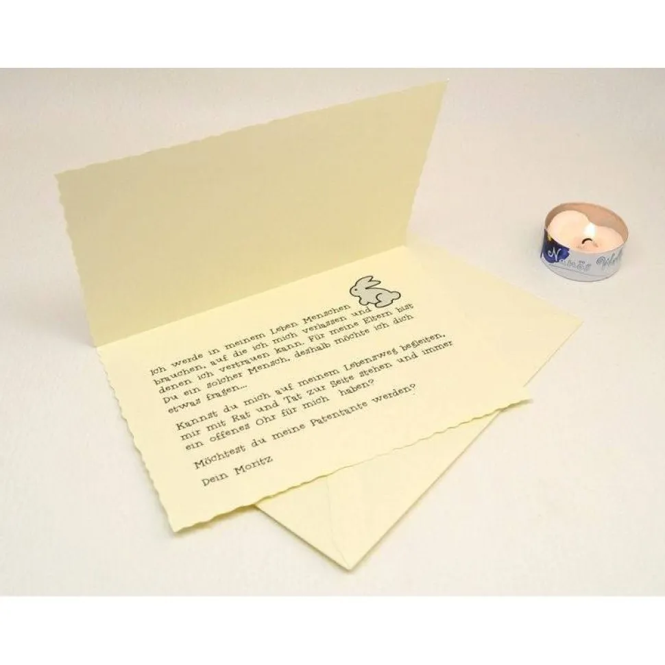 Die Karte ist individuell auf sehr festes Transparentpapier gedruckt und mit einer cremeweißen Büttenkarton Faltkarte verstärkt.