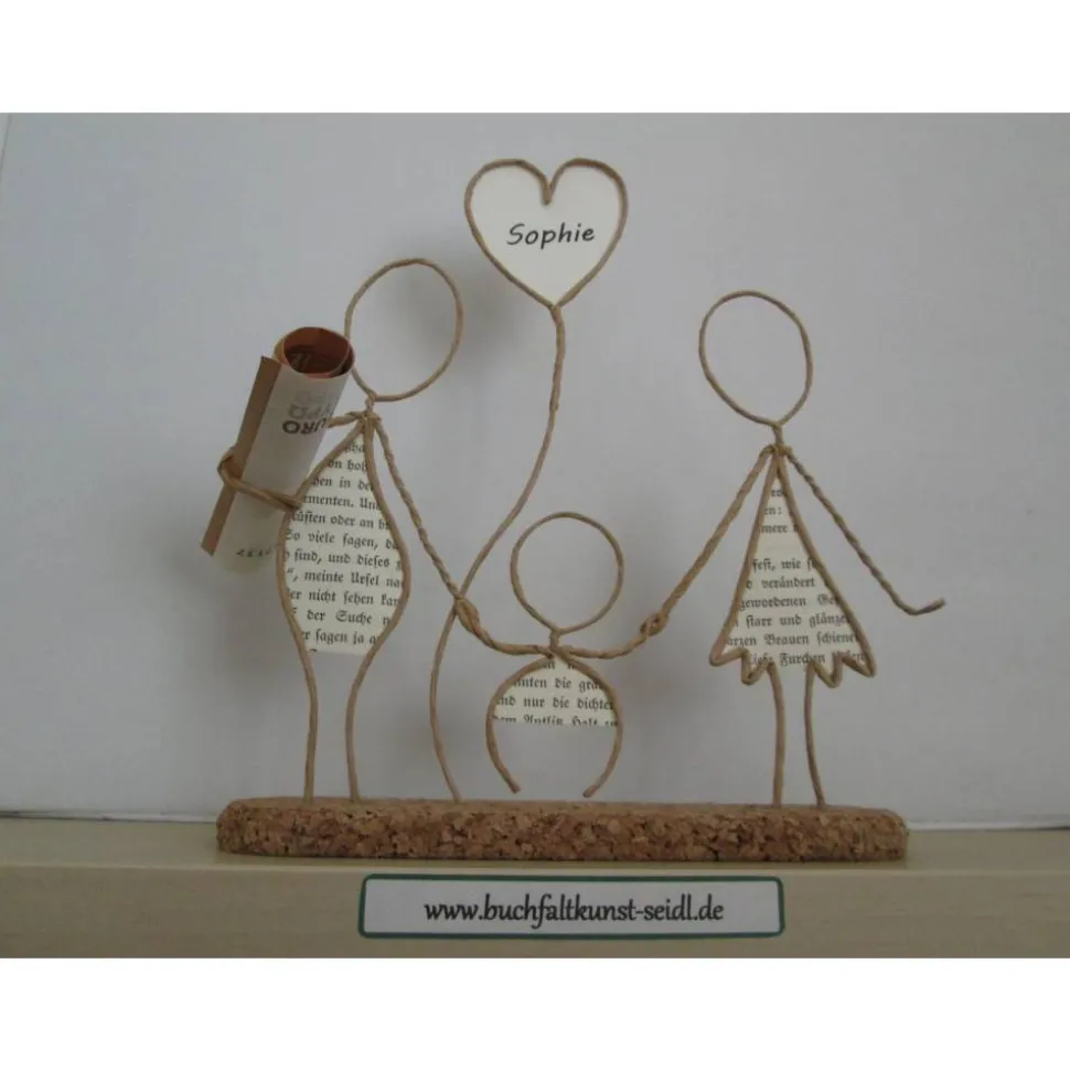 Meine zahlreichen, verschiedenen Drahtfiguren sind ein süßes, kleines Geschenk, z.B. für Hochzeit, Valentinstag, Geburtstag, Jahrestag, Weihnachten etc. oder eine hübsche Dekoration im eigenen Zuhause. Jede Figur fertige ich in liebevoller Handarbeit aus Papierdraht, Buchseiten mit altdeutscher Schrift und Korkplatten speziell für Sie an. Einige Figuren sind individualisierbar und personalisierbar, indem ich z.B. in die Schilder oder Herzen Ihre Wunsch-Namen oder -Wörter einfüge.