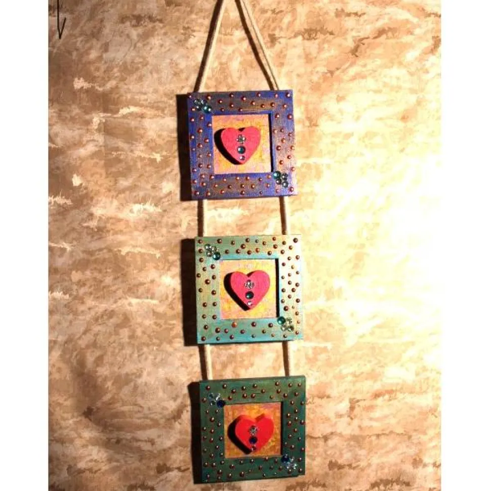 Die kleine Gestaltung besteht aus einem dreiteiligen Holzrahmen, befestigt an einer hellen Kordel.