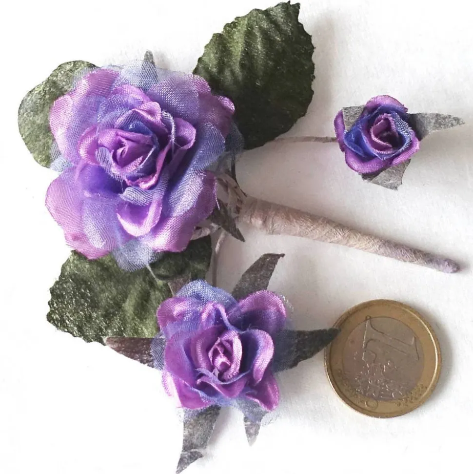 Duftiger Rosenzweig mit 3 Blüten, lila, als Deko auf einer Geschenkverpackung