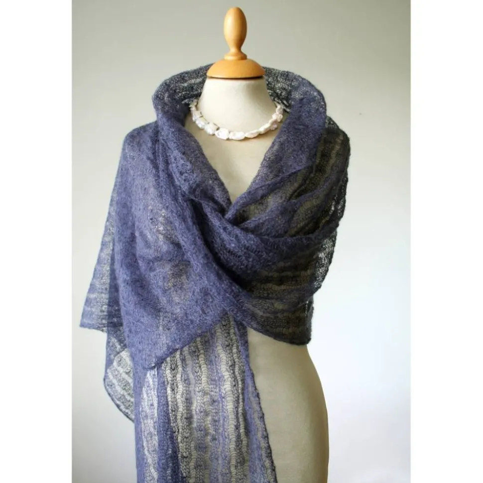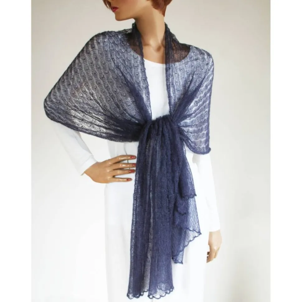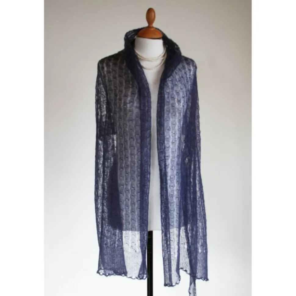Der duftige und hauchdünne Schal ist aus feinstem italienischen Garn handgefertigt. Das Accessoire ist sehr leicht, in sich gemustert und halbtransparent – an beiden Ende ist eine bogenförmige Bordüre.
