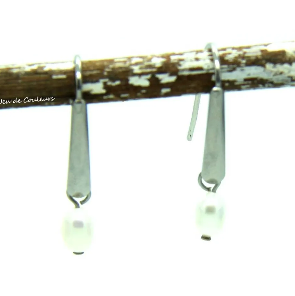 Die Basis dieses zeitlosen Ensembles ist ein Paar Edelstahl-Fischerhaken. An diese sind echte, weiße Süßwasser-Zucht-Perlen in Reisform eingehängt. Selbstverständlich sind die Ohrhaken mit transparenten Stoppern bestückt.