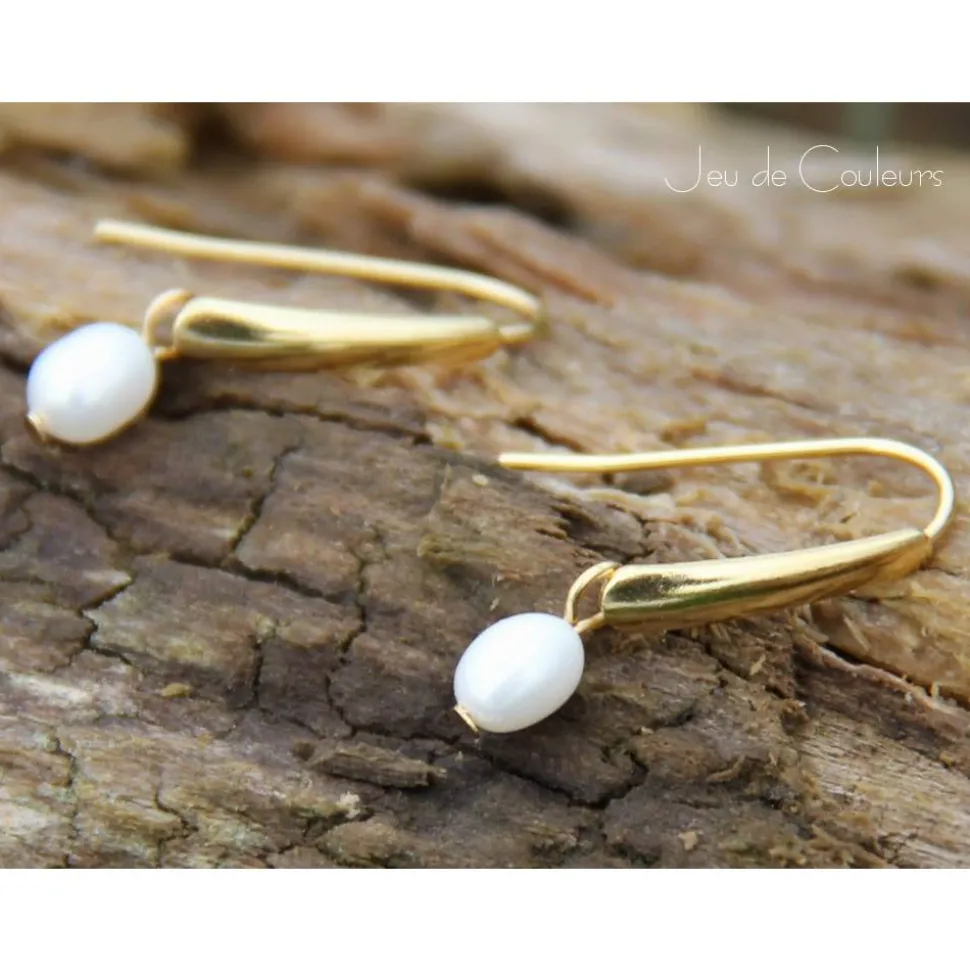 Die Basis dieses zeitlosen Ensembles ist ein Paar Edelstahl-Fischerhaken aus vergoldetem Edelstahl. An diese sind echte, weiße Süßwasser-Zucht-Perlen in Reisform eingehängt. Selbstverständlich sind die Ohrhaken mit transparenten Stoppern bestückt.