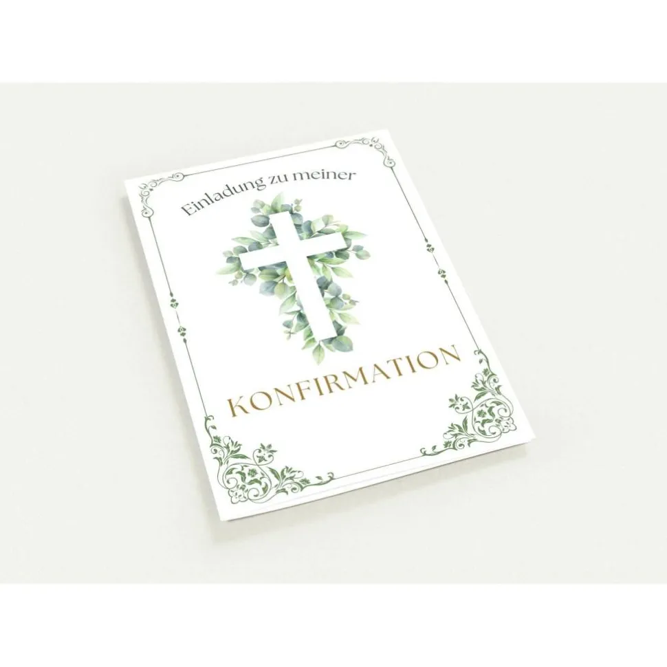 Jede edle Konfirmationskarte ist mit einem elegant-christlichen Motiv gestaltet: Ein zentrales Kreuz, umgeben von zarten Blättern, verleiht der Karte eine symbolstarke und zugleich natürliche Ausstrahlung. Die florale Bordüre, die die Karte dezent einrahmt, sorgt für eine elegante, feierliche Stimmung. Auf der Vorderseite befindet sich der Schriftzug „Einladung zu meiner Konfirmation“ in harmonisch abgestimmter Schriftart – klar, würdevoll und einladend. Auch die Rückseite greift das Kreuz- und Blätterdesign erneut auf, wodurch das Gesamtbild stimmig abgerundet wird. Das Motiv symbolisiert nicht nur den feierlichen Anlass, sondern auch die persönliche Bedeutung dieses besonderen Glaubensschrittes.