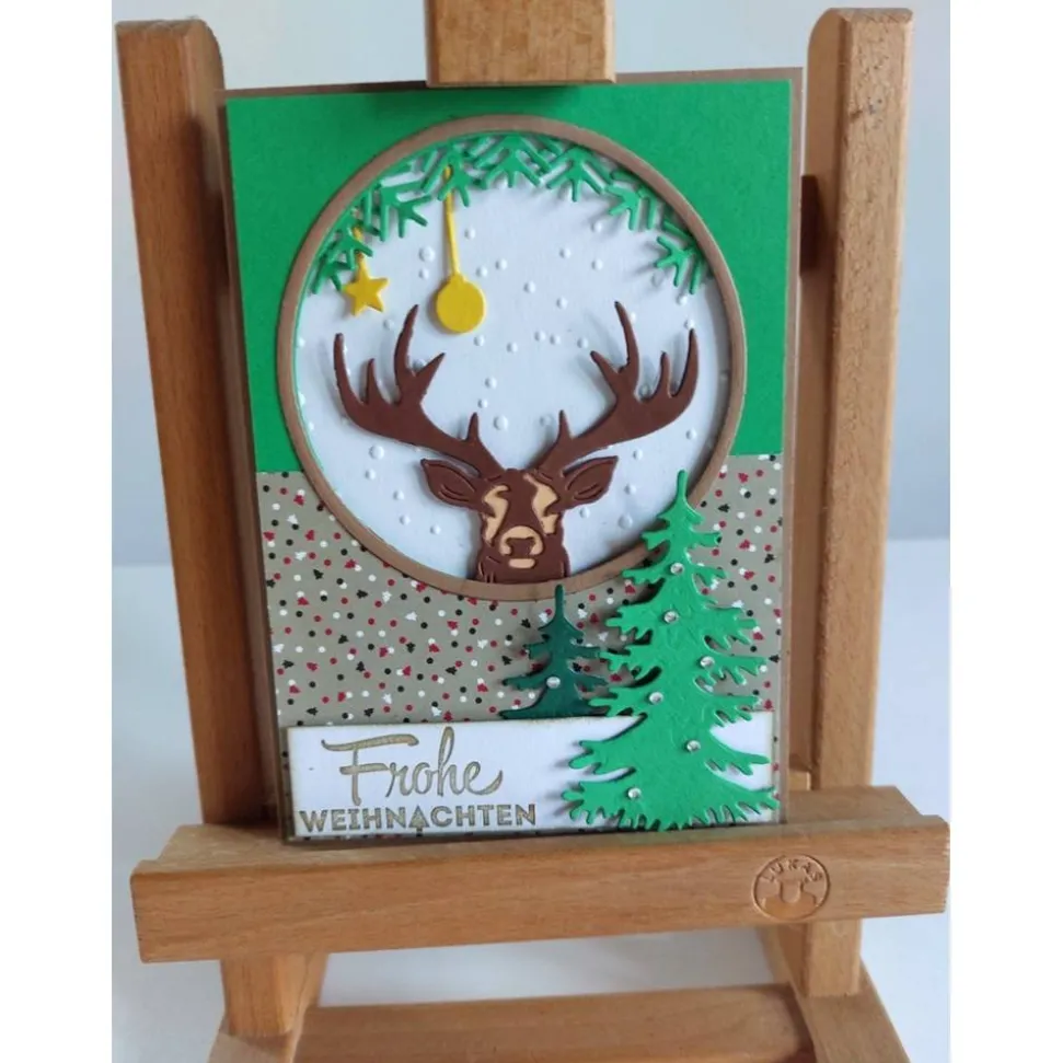 Verschenke dieses Jahr eine besonders edle Weihnachtskarte! Die aufwendig gearbeitete Klappkarte in grün/braun begeistert mit einem liebevoll aus mehreren Lagen gestalteten Hirsch auf geprägtem Hintergrund. Ein gestempelter Weihnachtsgruß und detailreiche Tannenbäume, die mit funkelnden Glitzersteinen verzierst sind, machen diese Karte zu einem echten Highlight.