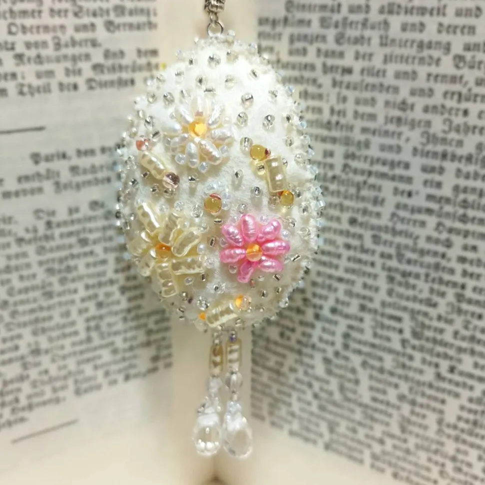 Das perlenbestickte Osterei ist innen gepolstert, von beiden Seiten aufwändig bestickt und funkelt wertig im Licht. Das kommt besonders schön zur Geltung beim Einsatz vom Osterei als als Deko im Osterstrauß oder Taufgesteck. Auch toll als Tischdeko zur Konfirmation. Im Christentum ist das Ei das Symbol für die Auferstehung Jesu. Das Ei ist ein Symbol für Leben, Wiedergeburt und den Ursprung der Welt. Opulentes Osterei mit einer Höhe von etwa 7 Zentimeter und einer Breite von 5 cm.und durch die Füllung und die Perlenstickerei ist dieses Perlenei etwa 2 cm stark. Komplette Länge mit Kettchen 22 cm. Diese Variation des Prunkei sieht auch toll aus als Schlüsseldeko zum shabby chic Stil oder Landhaus Ambiente am vintage Schrank oder Sekretär.