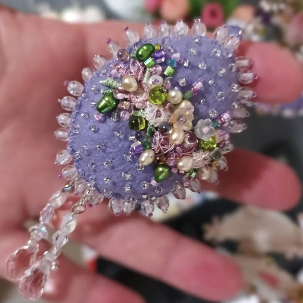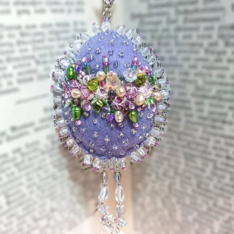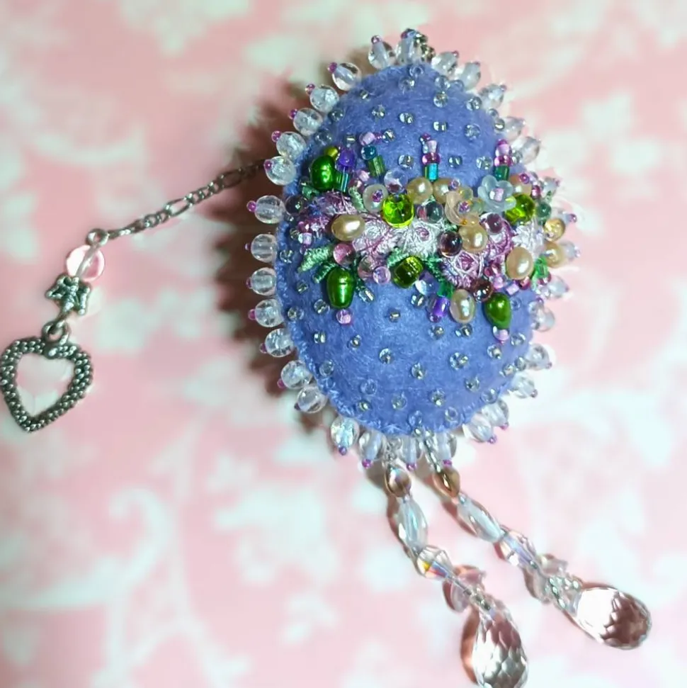 Das perlenbestickte Osterei ist innen gepolstert, von beiden Seiten aufwändig bestickt und funkelt wertig im Licht. Das kommt besonders schön zur Geltung beim Einsatz vom Osterei als als Deko im Osterstrauß oder Taufgesteck. Auch toll als Tischdeko zur Konfirmation. Im Christentum ist das Ei das Symbol für die Auferstehung Jesu. Das Ei ist ein Symbol für Leben, Wiedergeburt und den Ursprung der Welt. Opulentes Osterei mit einer Höhe von etwa 7 Zentimeter und einer Breite von 5 cm.und durch die Füllung und die Perlenstickerei ist dieses Perlenei etwa 2 cm stark. Komplette Länge mit Kettchen 22 cm. Diese Variation des Prunkei sieht auch toll aus als Schlüsseldeko zum shabby chic Stil oder Landhaus Ambiente am vintage Schrank oder Sekretär.