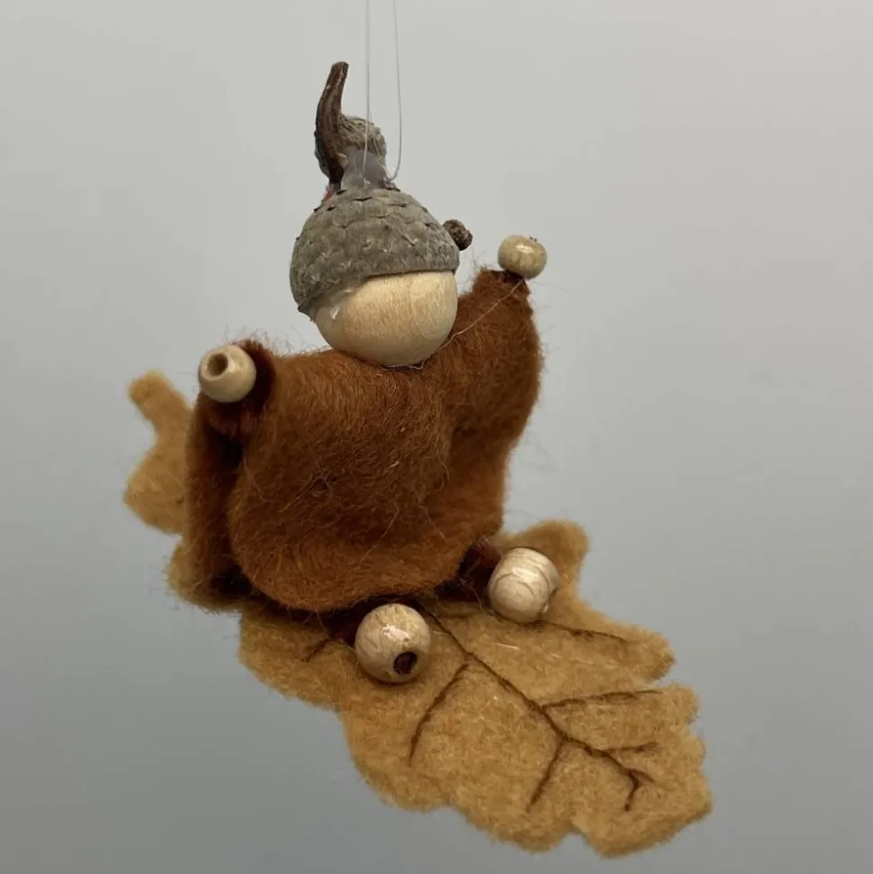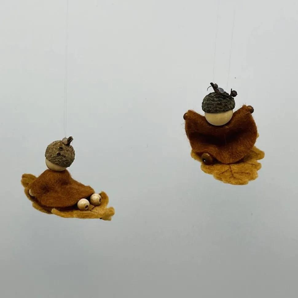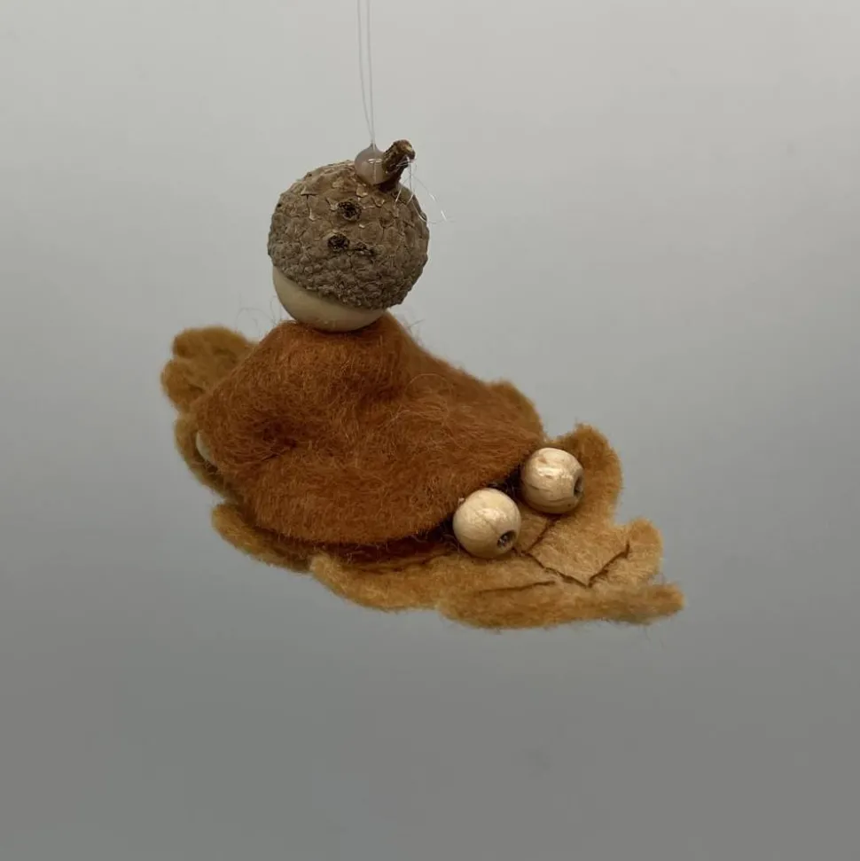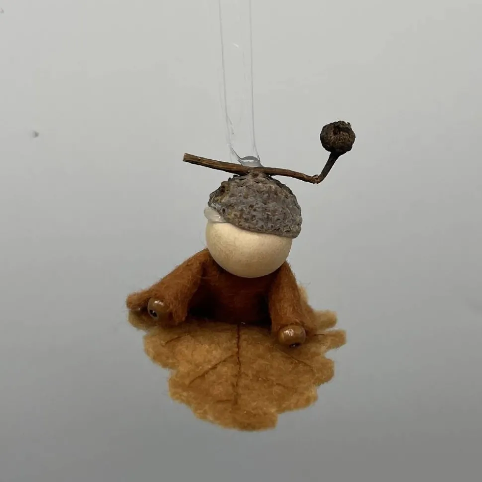 Kopf, Hände und Füße aus bunten Holzperlen, Kleid und Hut sind aus buntem Filz genäht. Das Eichenblatt ist aus Wollfilz welcher von mir noch bestickt wurde. Das Männchen sitzt oder liegt auf einem Eichenblatt.. Am Eichelhut ist ein durchsichtiger Nylonfaden befestigt, an welchen das Eichenmännchen aufgehängt werden kann.