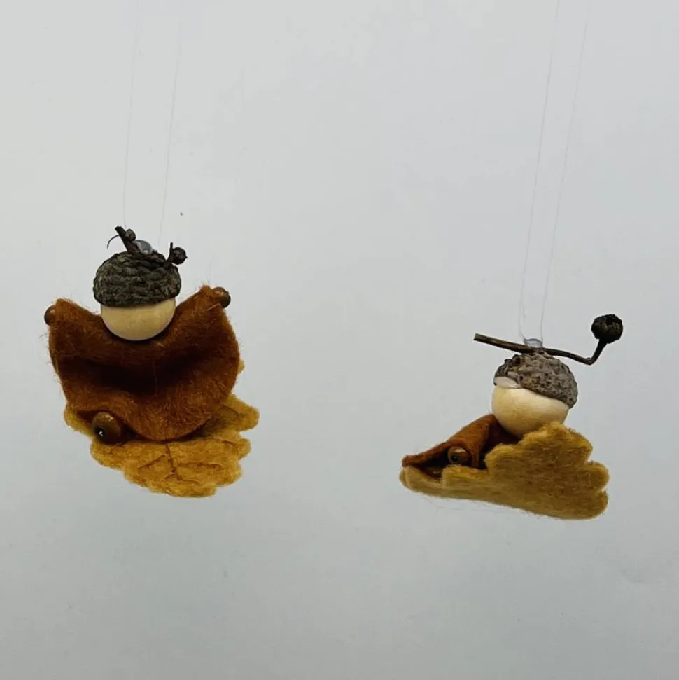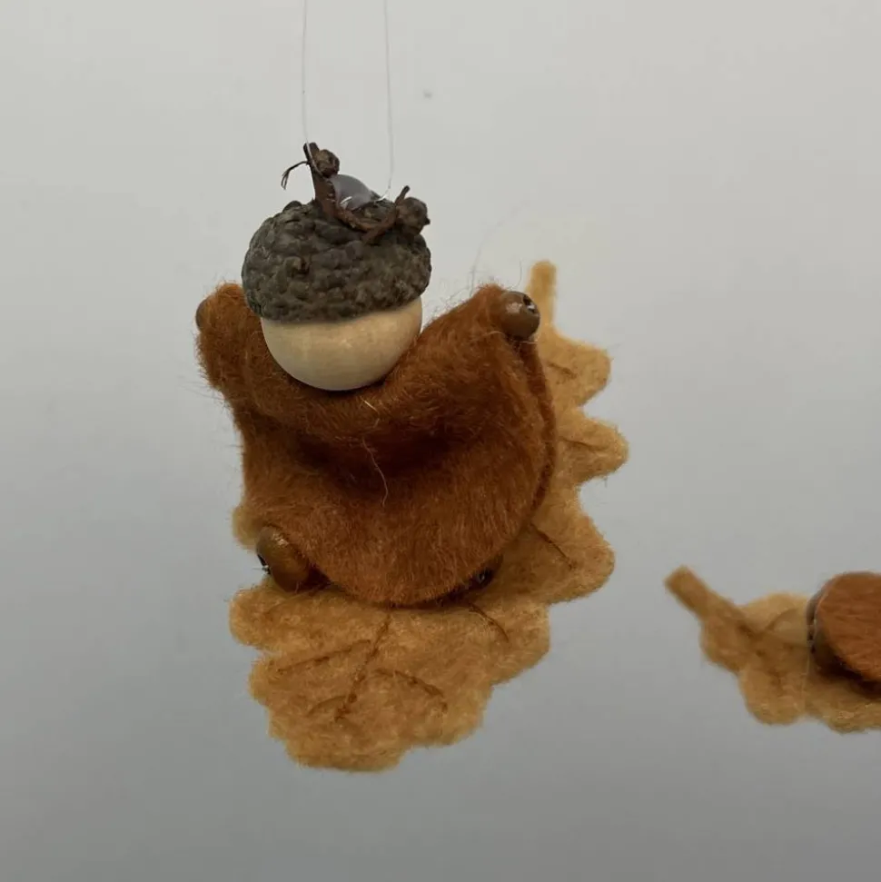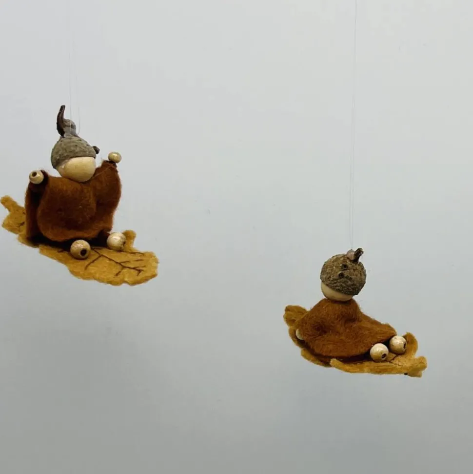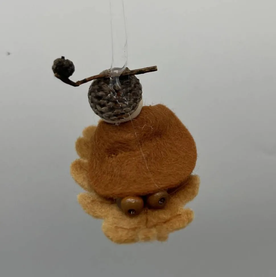 Kopf, Hände und Füße aus bunten Holzperlen, Kleid und Hut sind aus buntem Filz genäht. Das Eichenblatt ist aus Wollfilz welcher von mir noch bestickt wurde. Das Männchen sitzt oder liegt auf einem Eichenblatt.. Am Eichelhut ist ein durchsichtiger Nylonfaden befestigt, an welchen das Eichenmännchen aufgehängt werden kann.