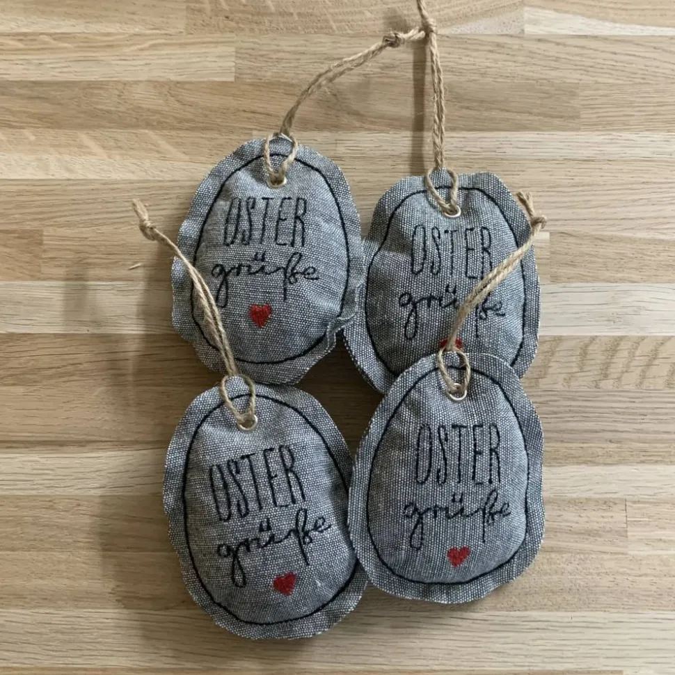 Tolle Ostereier aus grauem Leinen/Baumwollstoff, liebevoll bestickt mit der Stoffcut Datei, mit Polyesterwatte leicht gefüllt, mit silberfarbener Metallöse und Kordel zum Aufhängen, Größe ca. 7 x 9 cm