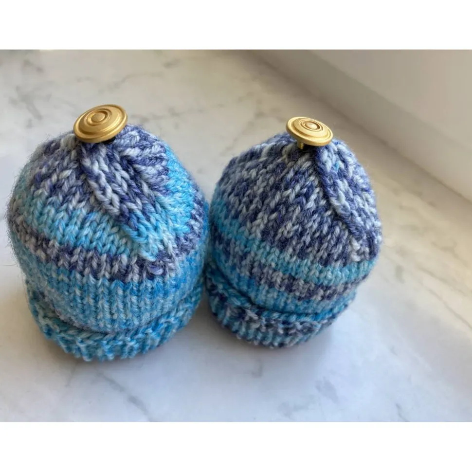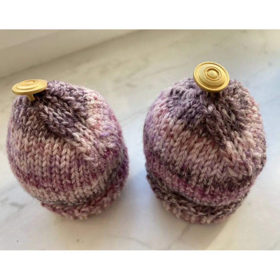 Die hier zum Kauf angebotenen Eierwärmer-Mützen sind aus Sockenwolle gestrickt in den durch den Fadenlauf vorgegebenen Farbkombination von blau-meliert, rosa-meliert und braun mit gelb. Das breite Bündchen ermöglicht einen Umschlag zum besseren Halt auf dem Ei. An der Spitze ist zusätzlich ein goldfarbener Knopf als Verzierung aufgenäht.