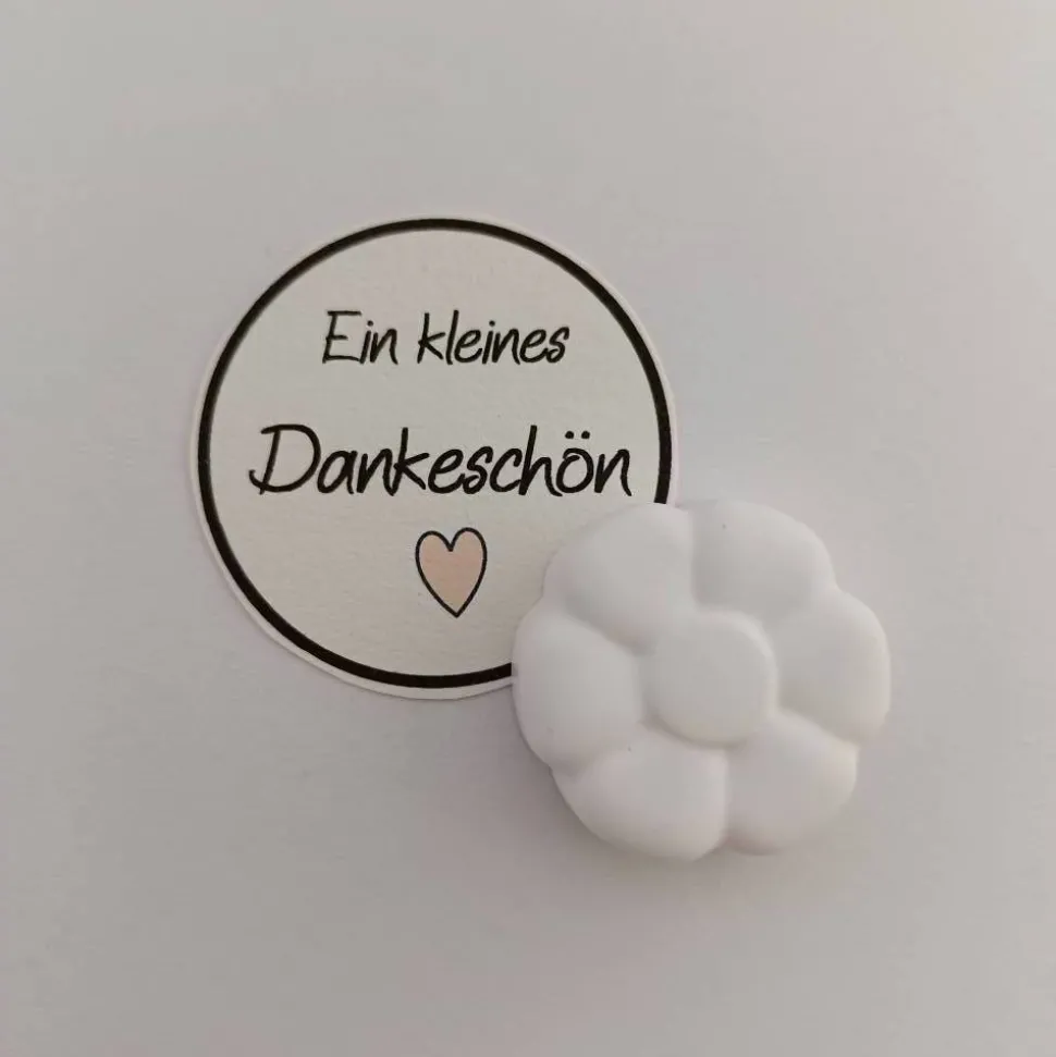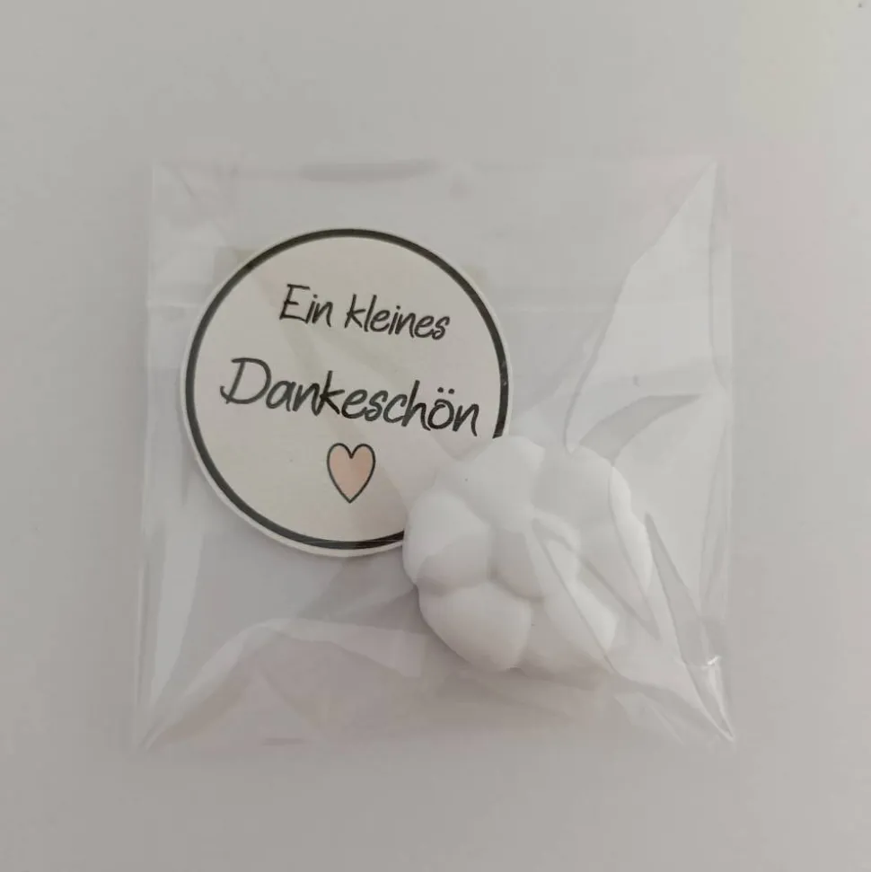 In dieser wunderschöne Tüte befindet sich ein Tonpapier mit der Aufschrift EIN KLEINES DANKESCHÖN! und einer Blume aus Raysin. Die Tüte hat eine Größe von etwa 7,5 cm x 7,5 cm.