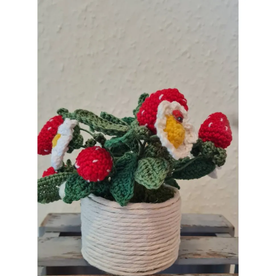 Ein liebevoll gefertigtes Arrangement, aus handgehäkelten Erdbeeren aus 100% Baumwolle