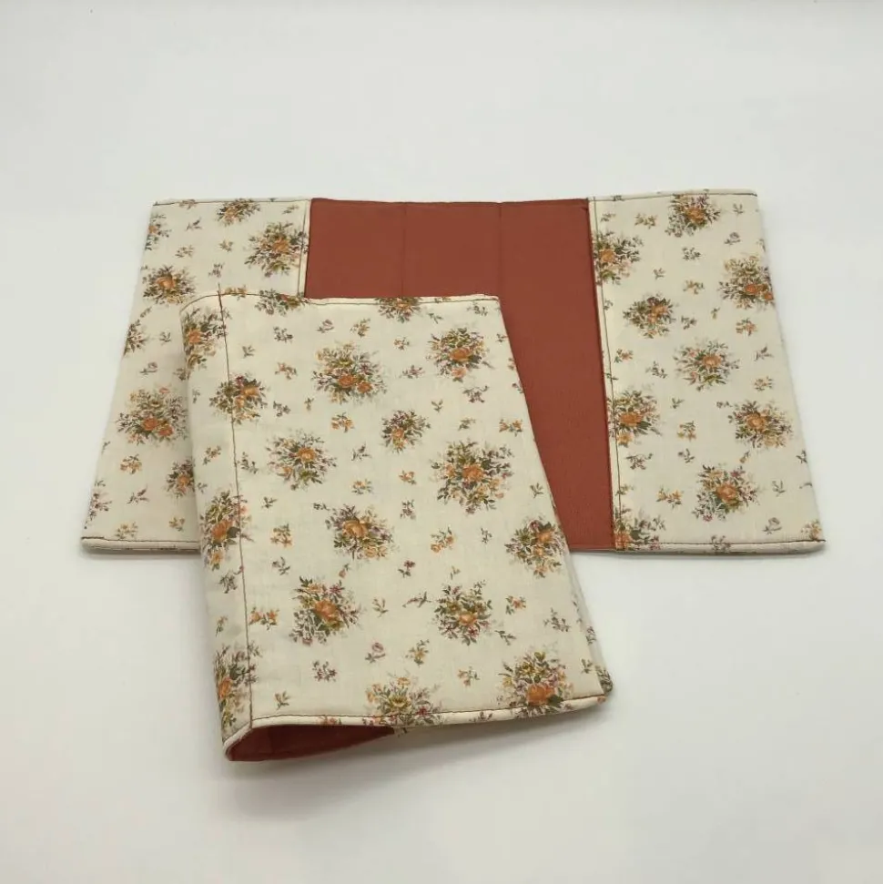 Hier ist der Einband in creme mit Blumen in orange/Terrakotta, der Innenstoff ist in passendem Terrakotta.