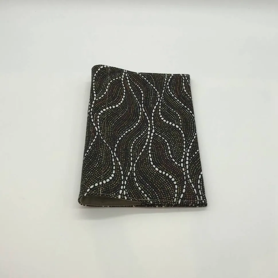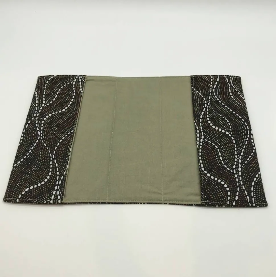 Hier ist der Einband in schwarz mit Muster in Erdtönen, der Innenstoff ist in olivgrün.