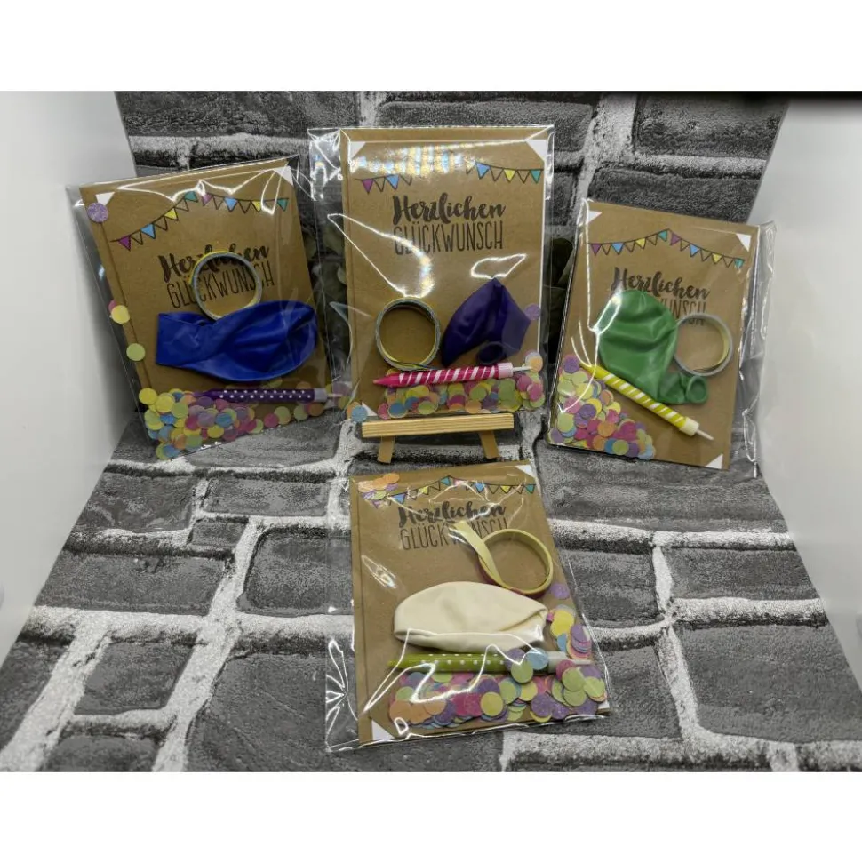 Ihr bekommt eine Bestempelte Klappkarte mit Umschlag und Einleger, eine Kerze in verschiedenen Farben (Farbe nicht wählbar), einen Luftballon, eine Luftschlange und Konfetti in einer Tütte.