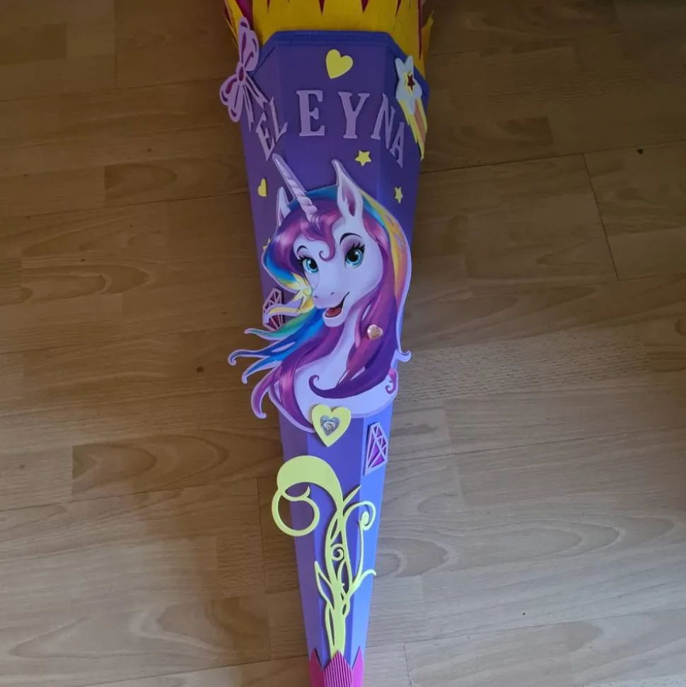 Ein wunderschönes Einhorn ziert diese Schultüte. Das Motiv kann farblich nicht abgeändert werden. Motiv ist aus Pappe welches auf Moosgummi geklebt wird.