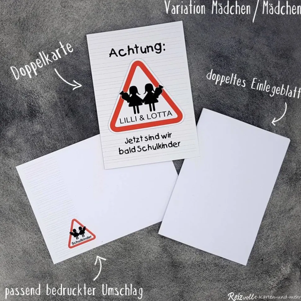 Entdecke die perfekte Einladungskarte zur Einschulung für Zwillinge im einzigartigen Achtung-Design!