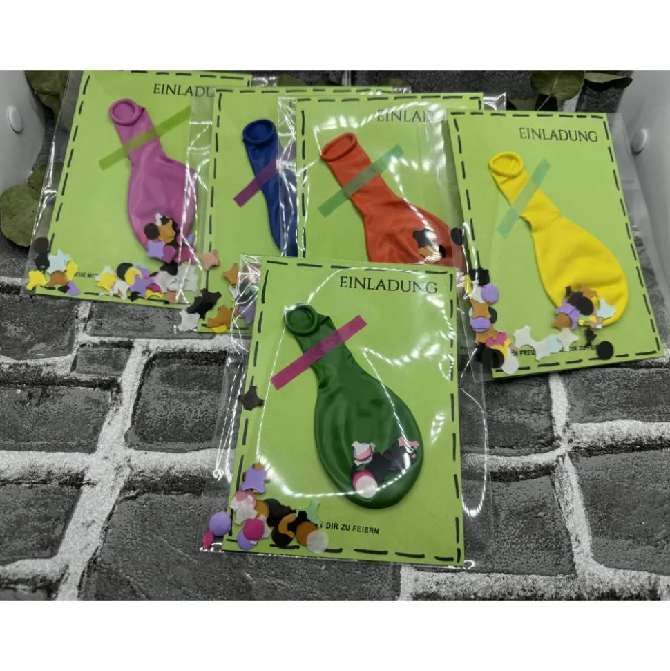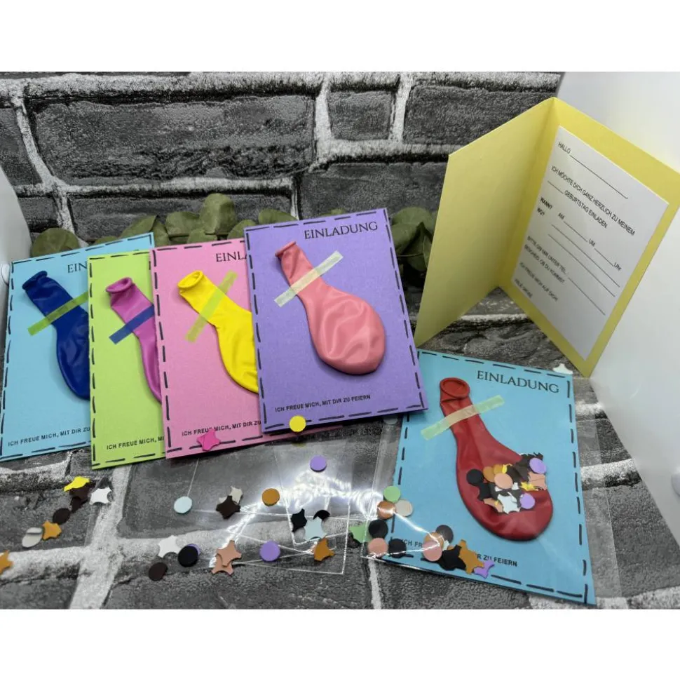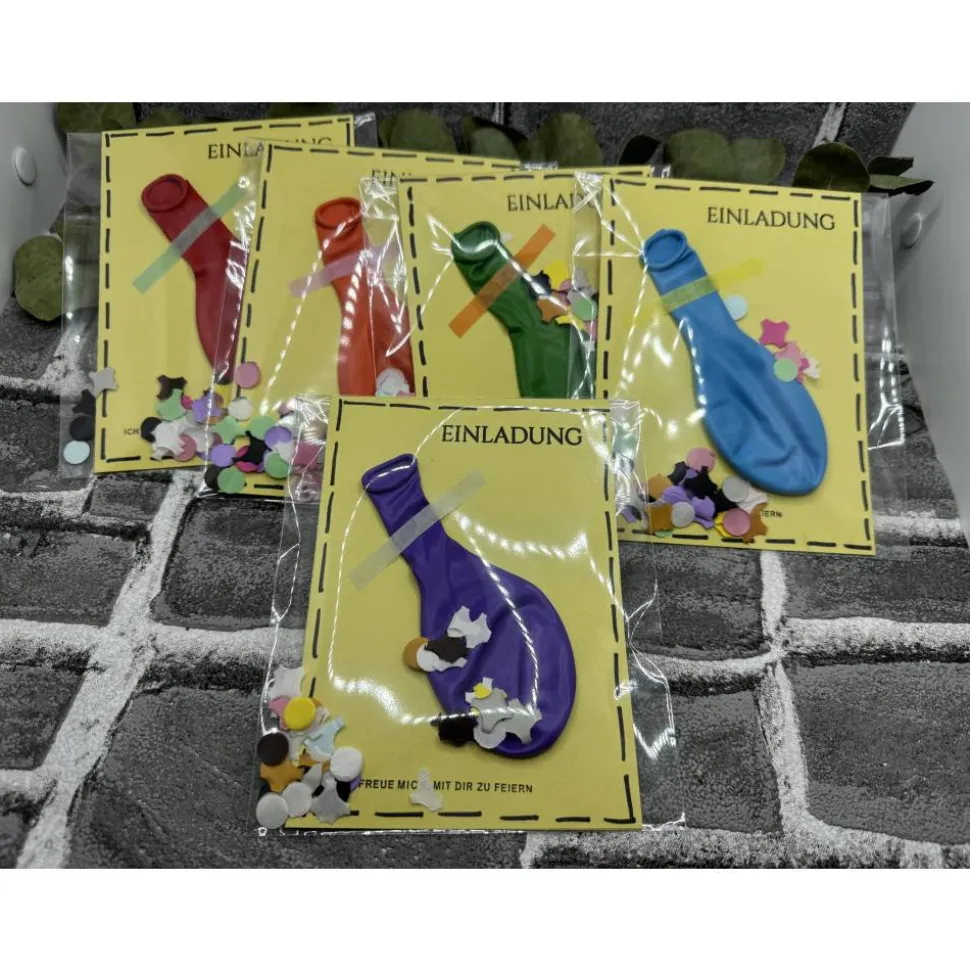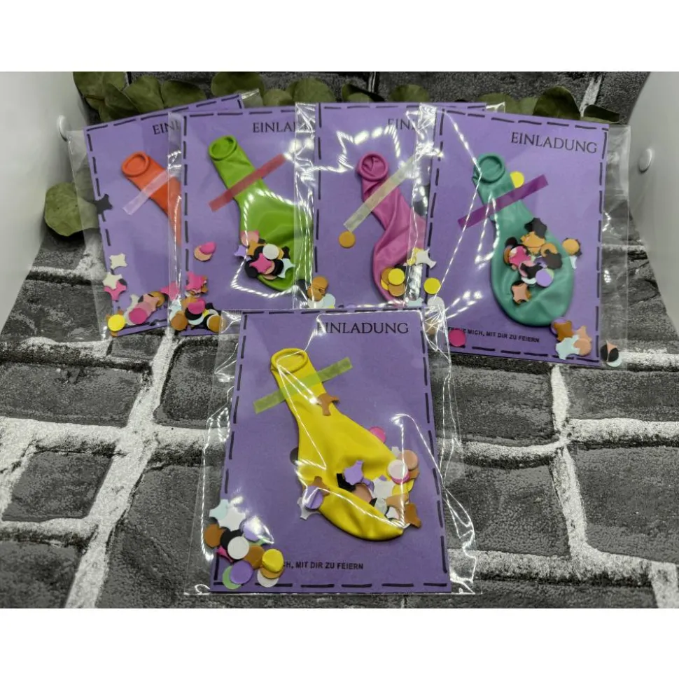 Klappkarte, Luftballon , Folienverpackung, Konfetti und ein vorgedruckter Einleger zum selber beschriften ( bereits eingeklebt).
